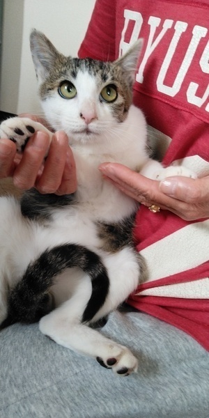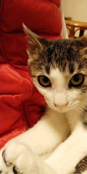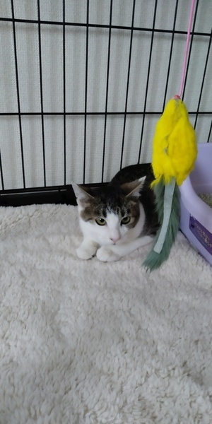 | 特徴(性格など) | 威嚇もなく大人しいキジシロの子猫です。最初は怖がりでしたが今は人懐っこくなっています。最近はオモチャでもよく遊びます。大人しい子猫ですので、初めての方でも飼いやすいと思います。先住猫とも仲よくなれると思います。カリカリやパウチを食べて元気です。トイレのしつけもできています。 痩せていましたが、今はふっくらとしてお顔がまあるくなりました。 柄はキジ白で、きりっとしたハンサム君です。しっぽは真っすぐです。 |