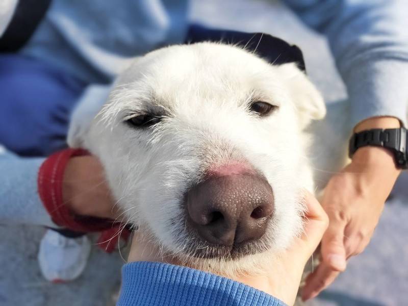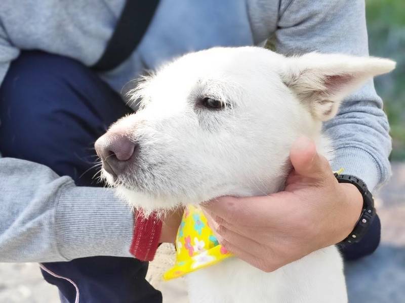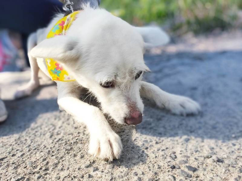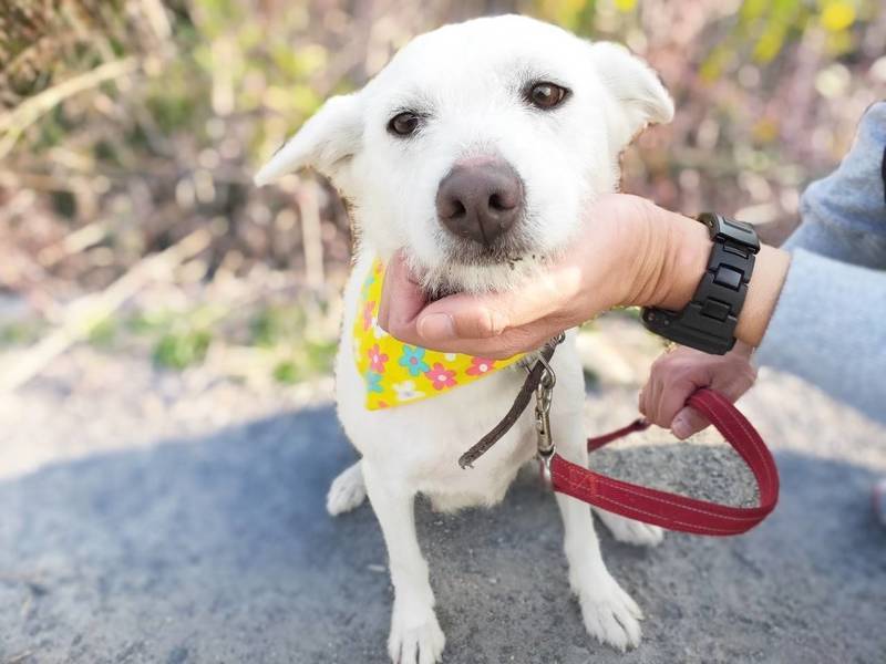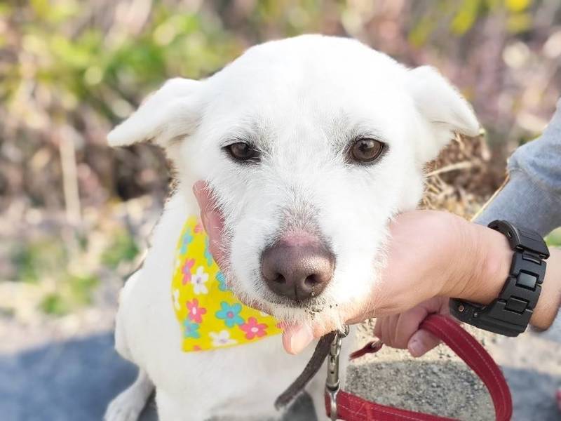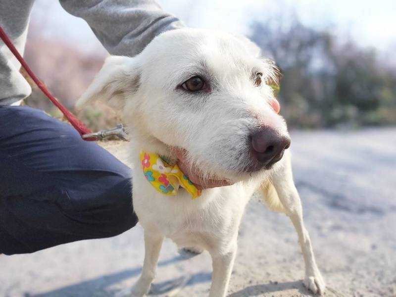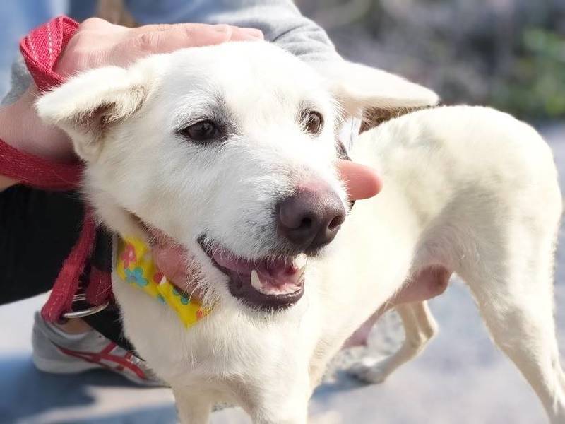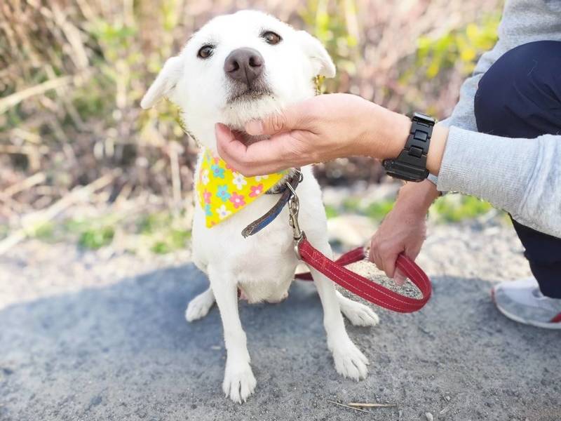 | 特徴(性格など) | 8キロの小柄な白ミックスの女の子です。とても優しい甘えたさんです。お散歩練習中で、初めは恐る恐る匍匐前進のようになりますが、慣れるとゆっくりと歩いてくれます。とても人懐っこいです。 | ||