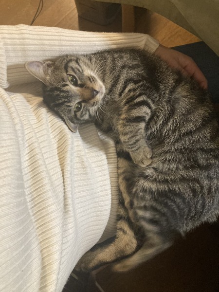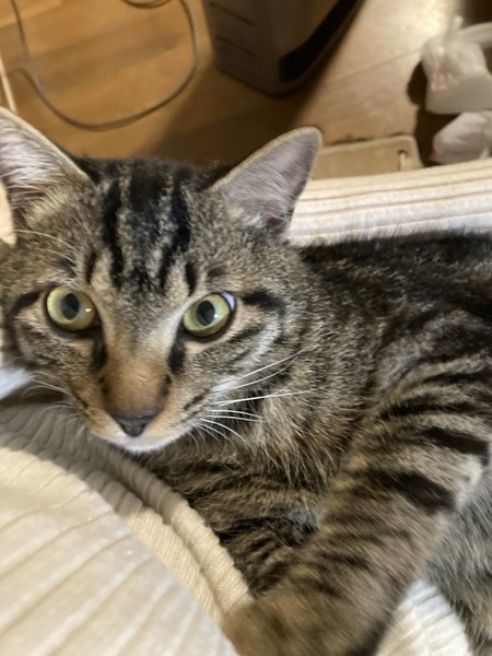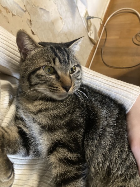 | 特徴(性格など) | 見た目はごくフツーのキジトラなのですが、「放ってはおけない、とても気になる何ともチャーミンングな」猫なんです。 とても甘えん坊です。昼間、眠くなればサッと膝に乗ってきます。 また、夜には寝室の電気が消えると「あっ!もう寝る時間だ。」と部屋に入り、フカフカのフリースがベチョベチョになるまでお母さんのオッパイを思い出して、フミフミ、ゴロゴロ。気が済むと布団に入って来ます。頭も良い子です。 |