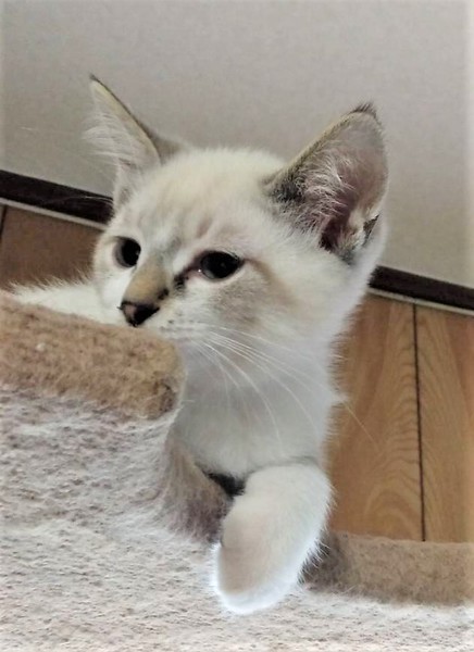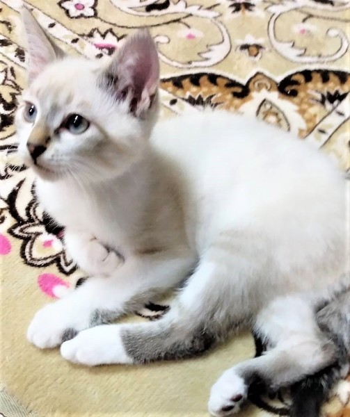 | 特徴(性格など) | 仮名: マロくん(オス) 毛色: シャムミックス風 性格: 兄妹の中で一番体が大きく、兄妹よりは大人の猫と良く遊んでいますので、先住猫がいるお家でも大丈夫です。 産まれた時から人が傍らにいたので、とても人馴れしています。 ノミ取り済 検便済 駆虫済 3種混合ワクチン済 猫エイズ・白血病ウィルス検査はともに陰性です。 |