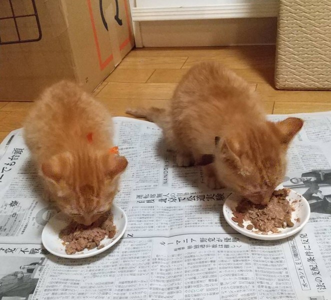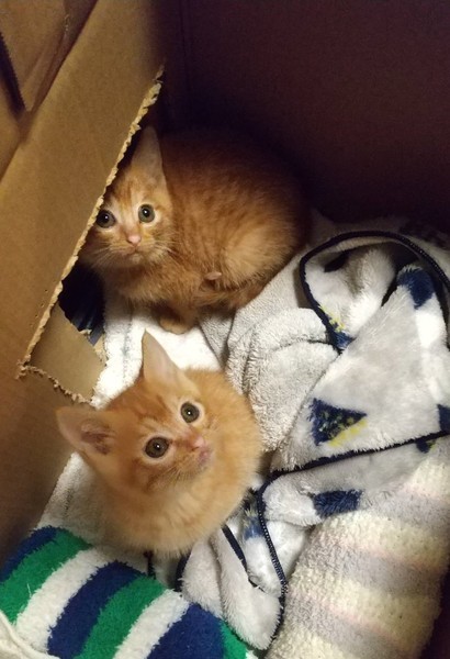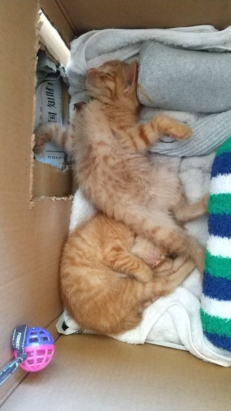 | 特徴(性格など) | 仮名:ダイくん&チィくん 性別:オス 月齢:推定10月末生まれ 毛柄:2匹とも茶トラ エイズ・白血病 2匹とも陰性 ノミダニ駆虫済 検便・駆虫済 耳鏡検査.皮膚掻爬検査済 性格 ダイくん マイペース。チィくんに対して身体こと体当たりして絡みますが、実は何気にビビリな一面も。 チィくん 穏やかな性格。ダイくんにやられっぱなしでしたが、最近体重も増え反撃出来るようになりました。 本当に仲良しで、いつも2匹で絡み合っています。追いかけっこやプロレスも激しいです。音のするボールや紐でも遊びます。 順番にシャンプーの時など片方の姿が見えないと、必死に呼んで探します。呼ばれた方もそれに応えて「いるよー」と返事します。 のどを撫でると、ヘソ天でゴロゴロ気持ち良さそうにしています。 2匹一緒に「家族」としてお迎えしていただける方、 脱走防止対策を必ず施し、ご家族全員が脱走防止への意識の高いお家とのご縁をお待ちしています。 子猫は可愛いですが手がかかります。 お勤めなどでお留守番のあるお家はご遠慮下さい。 また、同棲カップルの方、賃貸物件の方、ごめんなさい。 家族形態で持ち家の方を希望しています。 健康状態体調は良好です 生後約1ヶ月半、外で生活していたせいか、お互いの尻尾で遊んでしまうせいか分かりませんが、尻尾の毛が抜けています。 獣医師の診察を受け、真菌などの皮膚病ではありませんでした。 薬用シャンプーで少しずつ治しています。 |