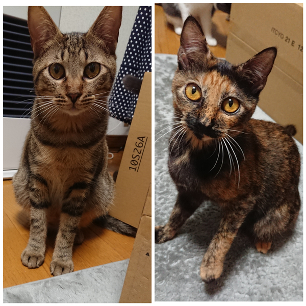 | 特徴(性格など) | サビ→神和 甘えっ子で、遊ぶの大好き❤️ 小春のことも大好き❤️ キジトラ→小春 甘えっ子で、遊ぶの大好き❤️ 神和も大好き❤️ 二人とも、慣れない人には、びくびくとびびりさんです 馴れるまでは、シャーもするかも… |
