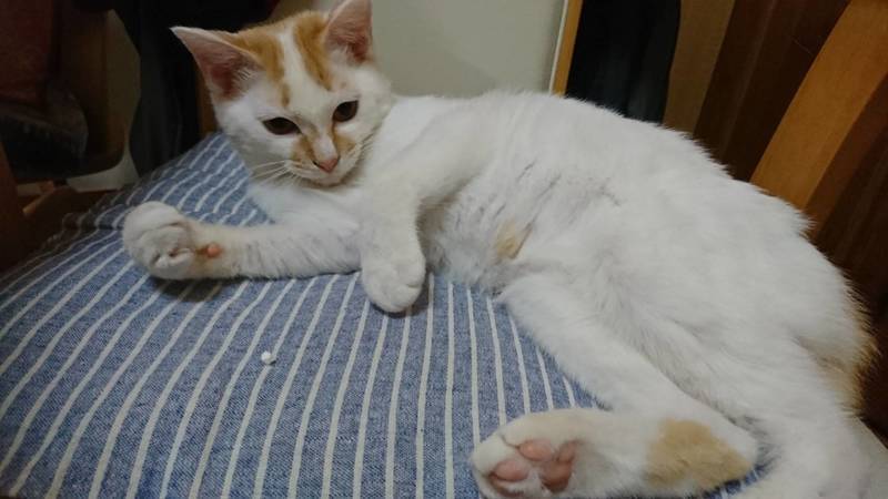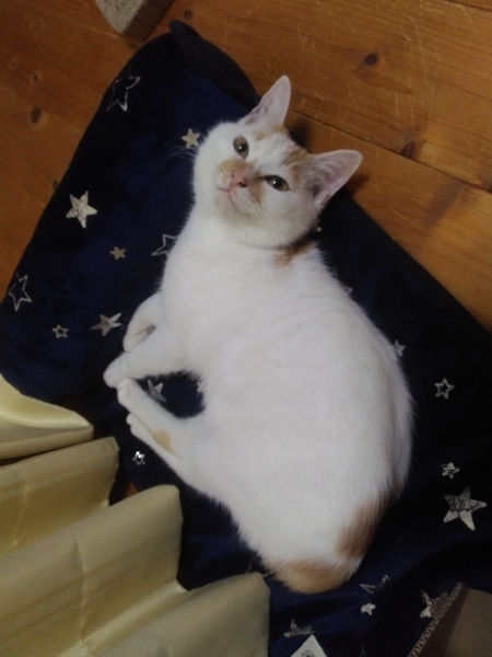 | 特徴(性格など) | (2021/9/11記載) 元気いっぱい! 甘えん坊な男の子です。 短い茶色のしっぽがチャームポイント。短いですが、かぎしっぽです。 人懐っこく、撫でてもらうのが大好き。 他の猫が撫でられていると、すーっとさりげなく割り込んできます。 とにかく元気で、寝てる時以外はずっとオモチャで遊ぶか、仲良しの猫と追い駆けっこしています。 我が家は多頭飼いですが、あまり他の猫に対しての好き嫌いが無いようで、どの猫にもフレンドリーに接してくれます。 (他の猫がすべて女の子なせいかもしれませんが) やや気弱な一面もあり、他の猫から威嚇されるとすぐに引き下がるので、先住猫ちゃんがいるお宅でも飼いやすいのではないかと思います。 (2021/9/11記載) 元気いっぱいな子ですが、たまに(3~4ヶ月に1回ぐらい)太もも?の裏あたりにアレルギー症状が出ることがあります。 ごく一部、毛が抜けて皮膚が赤くなります。 病院でアレルゲンを調べた結果、食べ物はすべて問題なし。 空気中の何かに反応しているのではないか、とのことでしたが、食べ物以外は調べられないそうなので、症状が出るたびに薬で抑える方法で対応しています。 そのため時々、足に異常がないか見てあげる必要があります。 |