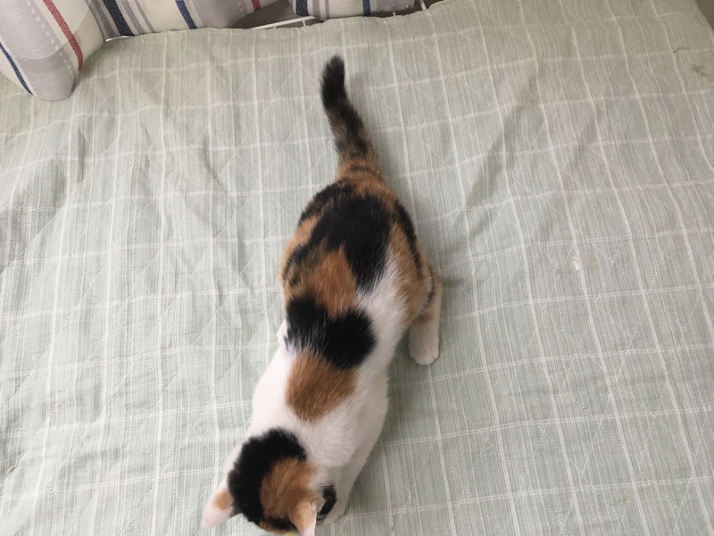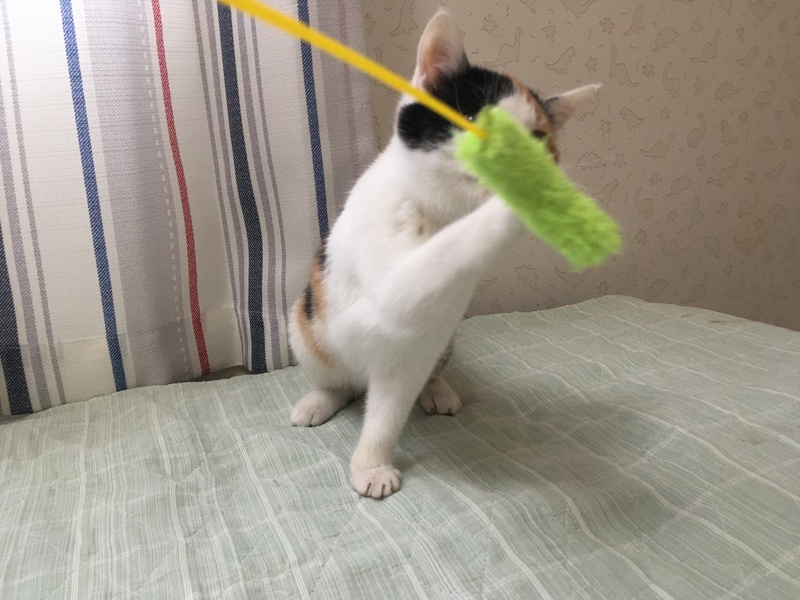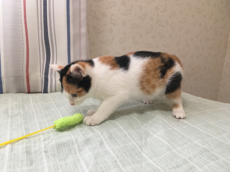 | 特徴(性格など) | 茶白のきょうだいで、マイペースな三毛猫ちゃんです。 人馴れしてきて、自己主張もしっかり出来る様になりました。 抱っこは苦手ですが、おもちゃで遊ぶのが大好きです。 |