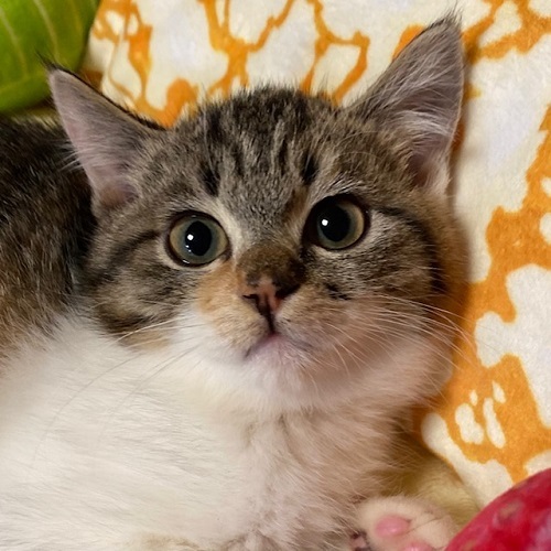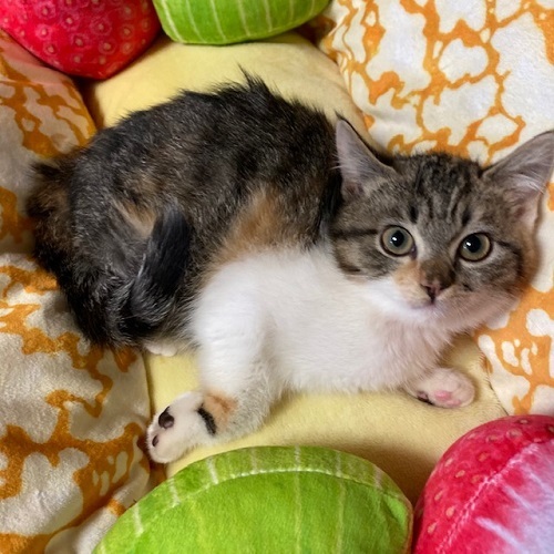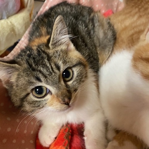 | 特徴(性格など) | さすが三毛ちゃん!保護して1ヶ月近くになるのに『わたち、貴女に心は売らないわよ!』と、言っています 笑 そうは言っても、それほど気は強くなくまん丸オメメとイカ耳で撫でさせてくれるのが可愛いすぎます♡ 兄妹のまっしゅくんと一緒にお迎えいただければ嬉しいです。 |