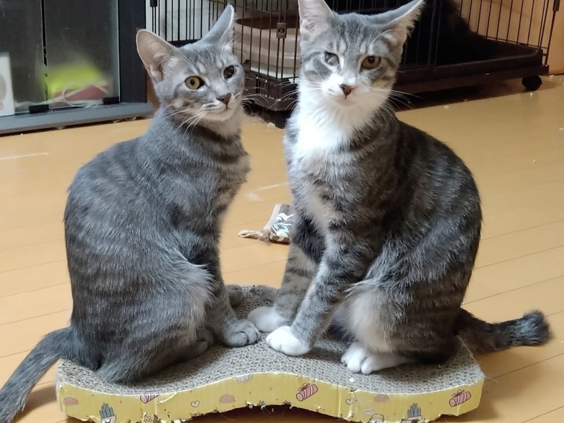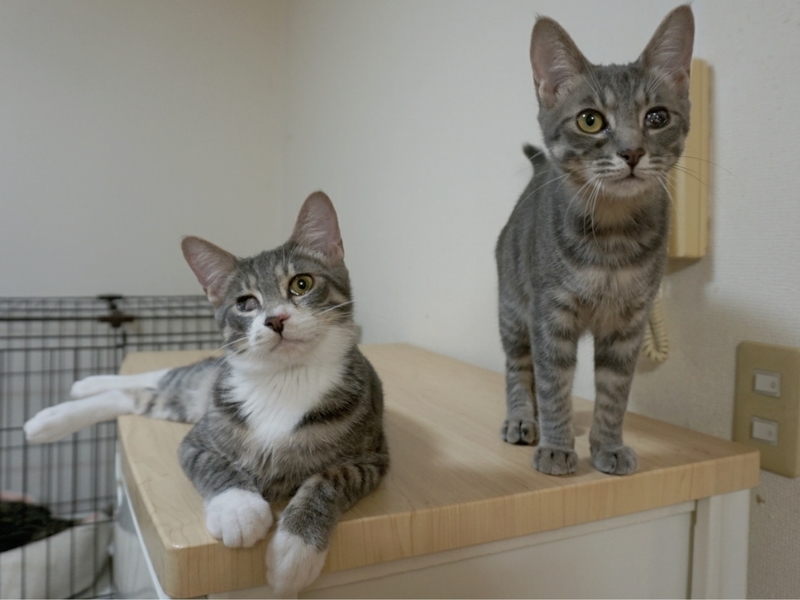 | 特徴(性格など) | 生年月日:2020年10月1日 室内で生まれ甘々の母猫に育てられたので、人慣れ抜群・天真爛漫系で甘え上手。 よく食べ、よく遊び、元気いっぱいです。 それぞれ目にハンディがありますが、現在は目やにや涙などの症状もなく、気にする様子もなく、毎日楽しく過ごしています。 バッカス(ブルータビー&ホワイト/男の子) 右目の瞬膜が出たままになっており、恐らくほとんど見えていません。 本にゃんは気にすることもなくやんちゃ盛りの甘えん坊です。 とにかく撫でられることが好きで、ついついお尻が上がってしまいます。 猫というより、性格はほぼ犬です。笑 ミネルバ(ブルータビー/女の子) 左目の角膜に異常があり、一見痛々しい見た目、恐らく見えていないだろうという診断を受けています。 運動神経抜群、賢くて器用、甘え上手な女の子です。 スリスリ大好きで、スリゴロが始まると周りが見えなくなり、テーブルや棚から落っこちそうになったことは一度や二度ではありません。 とにかく可愛い子です。 ☆不妊去勢手術済 ☆ワクチン3回済 ☆ノミダニ取り済 ☆駆虫済 ☆マイクロチップ挿入済 ☆トイレしつけ済 ☆ウイルス検査 エイズ 陰性、白血病 陰性 |