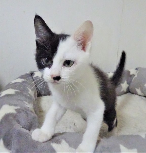 | 特徴(性格など) | 仮名: きいちゃん(メス) 毛色: 白黒(黒部分はグレーっぽい)尻尾長い 性格: 小さいのでまだ個性ははっきりわかりません。特別ビビリでもないようです。同じ月齢の子達と良く遊んでいます。月齢からすると小さめです。 ミルクから育っていますので、人を怖がりません。 飼い主さんの安心の為にケージをお使いになることをお勧めします。 ノミ取り済 検便済 駆虫済 3種混合ワクチン済 猫エイズ・白血病ウィルス検査はともに陰性です。 |