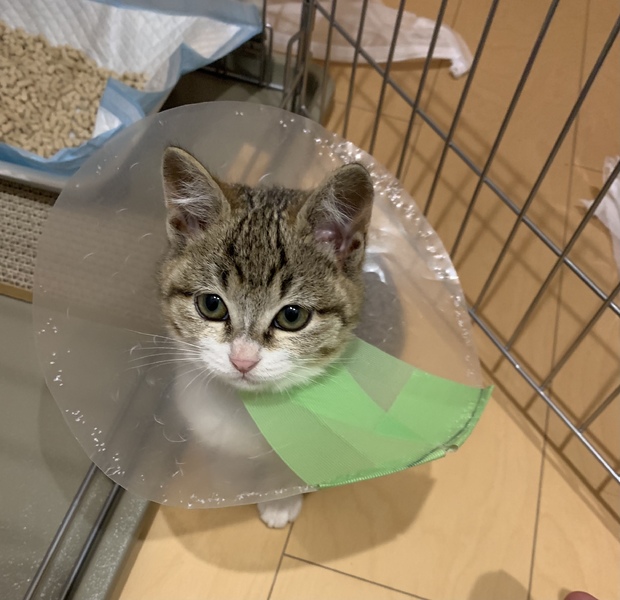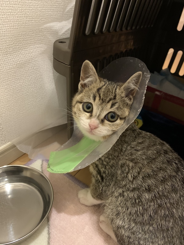| 特徴(性格など) | 元気で人懐っこいキジ白のメス猫です。顔もすごく可愛いです。膝に乗ってきます。撫でられるのもおもちゃで遊ぶのも大好きです。事故で尻尾が半分しかありませんが、病院にて治療済みです。ノミダニ駆除済み。エイズ検査は抗体陽性でした。しかし、疑陽性の可能性があります。まだ幼体の為、きちんとした結果はもう少し月を重ねてから検査しないとわかりません。写真より少しだけ大きくなりました。治療用の首のエリザベスカラーは 今は外れています。 |