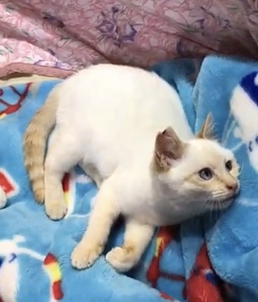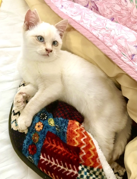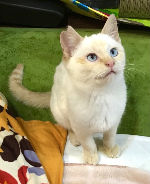 | 特徴(性格など) | 耳とシッポがちょっぴり茶色くて なんとなくシャムっぽい白ネコくん^ ^ 名前は、キュウちゃん。 小さな体に子猫らしからぬエキゾチックな 顔つきが、とってもキュートです! 保護当初は怖がりでしたが、今はすっかり人馴れしています。 とても甘えんぼで、おもちゃ遊びが大好きです。 好奇心旺盛で、大人猫さんにも物おじせず、とても懐こい男の子です。 先住さんがいるお宅でも、すぐに仲良くなれると思います。 |