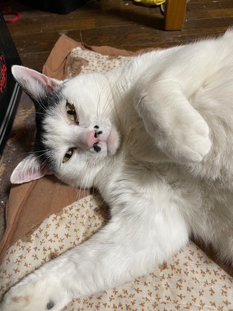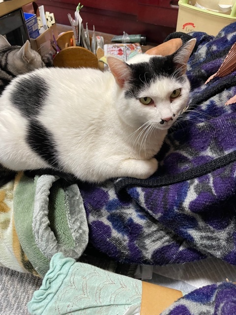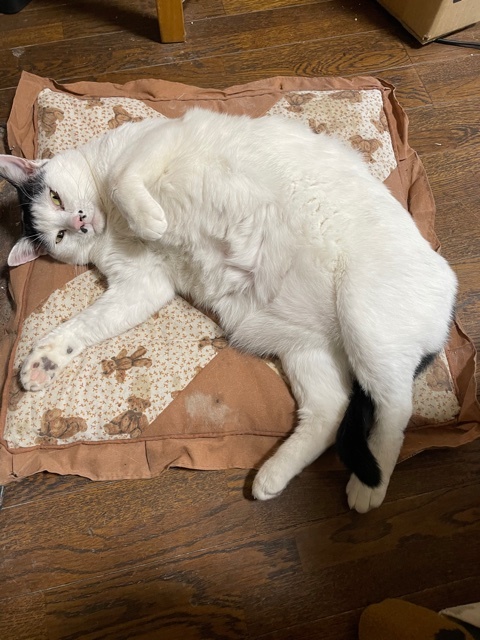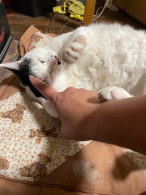 | 特徴(性格など) | おっとりな性格でほかの猫と大喧嘩は全くしません。(たまに小競り合いはします。) ほぼ白色ですが頭と鼻、背中にに黒のちょび柄が。 体は大福もちのような豊満なお腹ww ぽよんぽよんです(^^) 爪切りなどは嫌がりますが手早くなら我慢します。 人間には数日(2~3日)で慣れ、呼ぶと大きな体を乗せてきます。 |