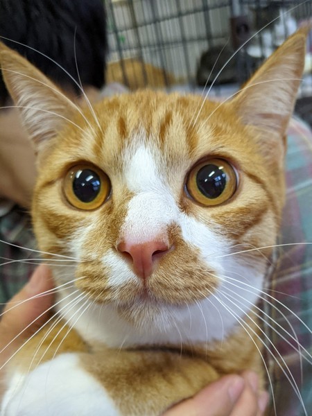 | 特徴(性格など) | 2020.4.19生まれ(推定) 毛色:茶白 白い手袋と白い靴下を履いた茶白の男の子。 長めの尻尾は「幸せの扉を開けてくれる」と言う言い伝えがあるカギしっぽ♪ 人が大好きで常に人の気配のするところにいたい甘ったれボーイ♡ キャットドアの使い方を3日で習得したお利口さん。 兄妹猫のビビアンと共に、ケージの中で過ごすこともあるので、良い子でお留守番も出来ます。 |