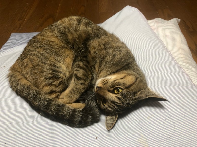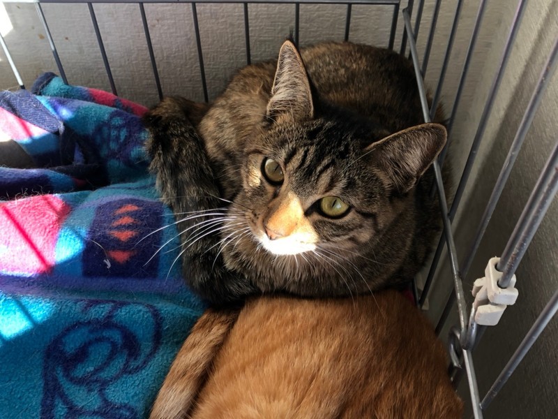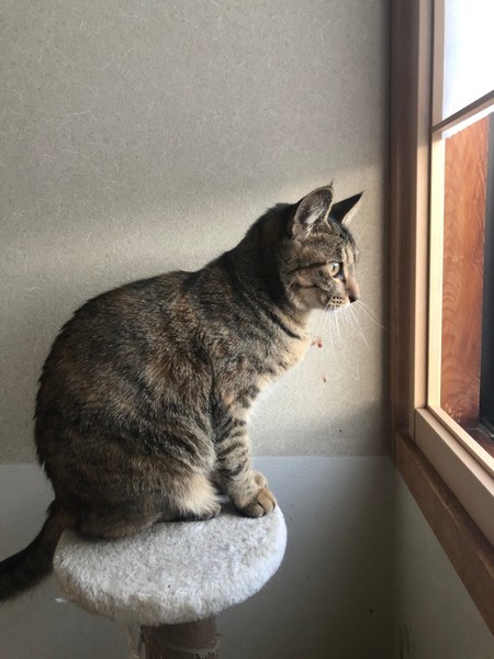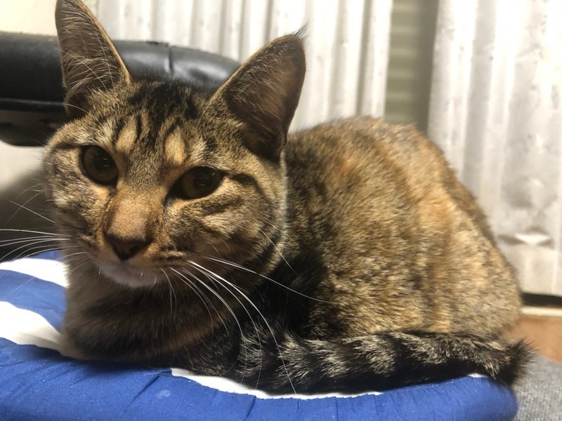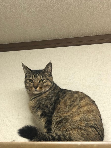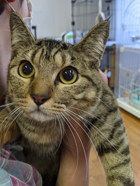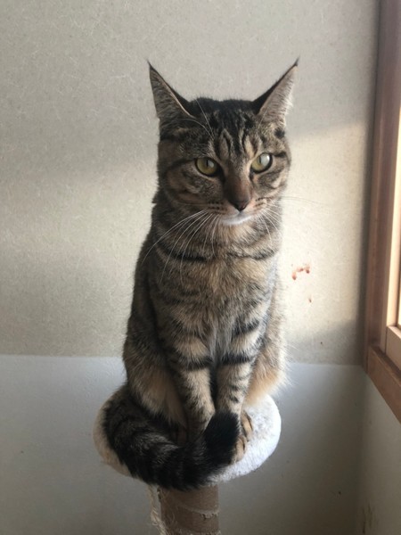| 特徴(性格など) | 2020.4.19生まれ(推定) 毛色:キジトラ ボディに比べて濃いキジ模様になっている、真っ直ぐな尻尾がご自慢です☆ 抱っこはちょっと苦手だけど、ナデナデをしてもらうのは大~好き!! お尻をポンポンしてもらうと嬉しくてゴロゴロいいながらへそ天をすることも♡ 何かして欲しい時は少し高めの声で鳴いて教えてくれます。 好奇心旺盛で怖いもの知らずのところがあります。 兄妹猫のビリーと共に、ケージの中で過ごすこともあるので、お留守番も良い子に出来ます。 |