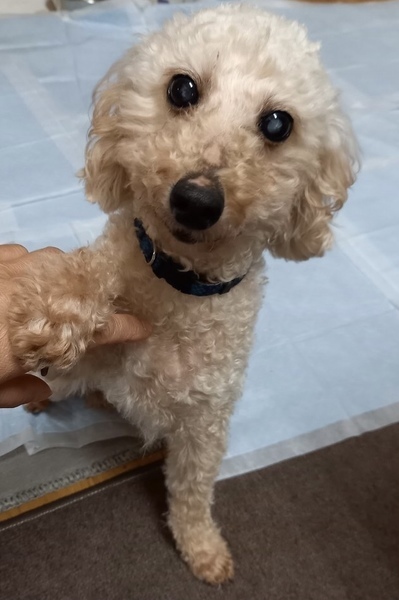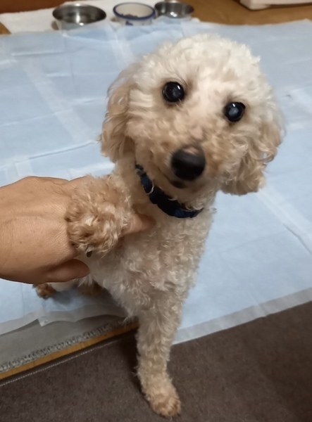 | 特徴(性格など) | 可愛いトイプーむぎちゃん 推定年齢6~7歳 フィラリア(-) 白内障あり 日常生活は普通におくれますが、視力がかなり弱いと思われます。 もともとの性格もあると思いますが、慎重で怖がることも多いです。 ワンワンという鳴き声も聞いていません。犬はちょっと苦手なようです。 視力が弱いため、犬に対して警戒している可能性があります。 トイレは、うまくいったり、失敗したり…半々ぐらいのようです。 怖がりさんなので、叱ったりするより、気長に見届けていただいて、「まぁ、失敗するならお出かけする時は、かわいいおむつ使ったらいいか…」ぐらいのおおらかさで対応していただけるといいかと思います。 こんなむぎちゃんですが、人にはとっても甘えん坊さん。 「ねぇねぇ、かまってください」と、前足で、ちょんちょんと催促する姿など、胸キュンです。 これから、おしゃれカットができるようになったら、見た目もどんどんかわいくなるし、 新しい生活にも慣れたら、もっと甘えん坊さんになると思います。 成長が楽しみ! |