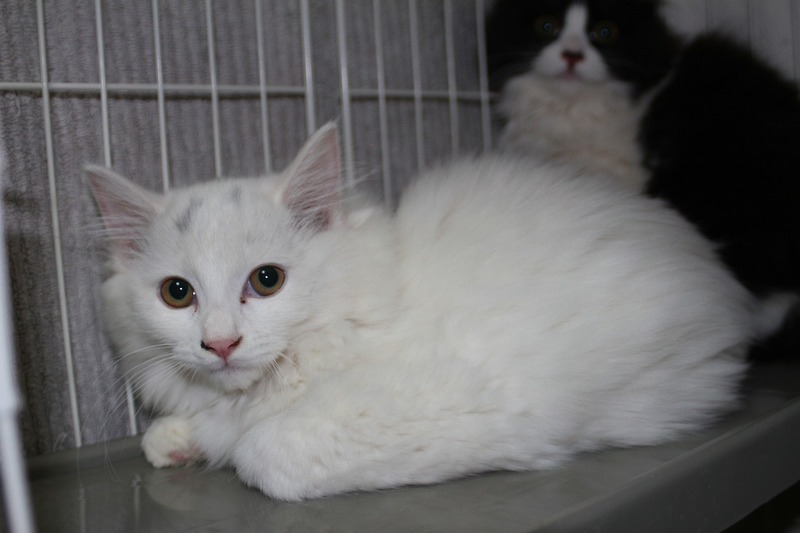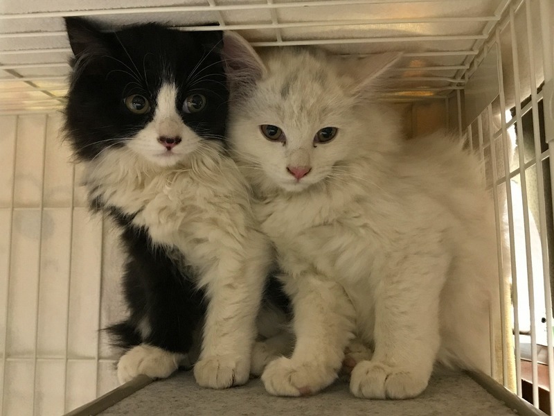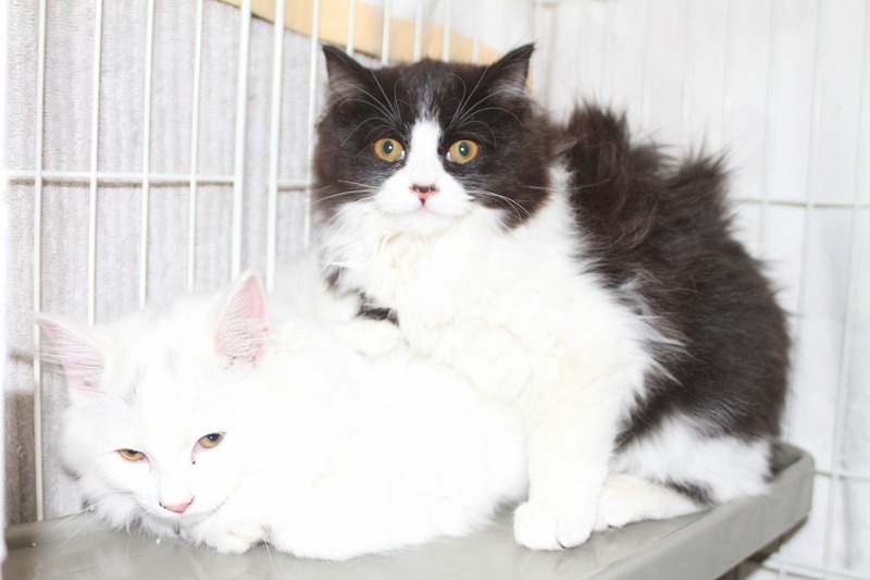 | 特徴(性格など) | ホントに元ノラさん?って言う位?長毛美形な兄妹です。 元気にお部屋の中を走り回ったり、食欲も旺盛で健康です。 トイレ躾OK、お腹がすいたり寂しい時は可愛い声で鳴きます。 お兄ちゃんは白の仮称「レオ君」 妹は白黒ハチワレの「サクラちゃん」です。 |