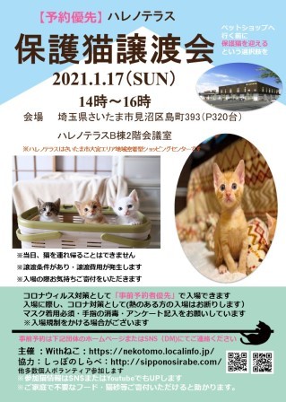 | その他(譲渡条件など) | ♡Tiktok/Instagramにてレミを馴らしている動画配信しております。@withneko2222 【ご応募いただく方へ】 ☆☆大変申し訳ないのですが、新型コロナウイルス感染症対策のため、双方が納得した場合は お見合い=譲渡という形を取らせていただきます。 ですので その日までに必ずケージ トイレのご用意はお願いします。 お見合いをしてみてからという方は 各譲渡会に予約を入れていただき(譲渡会情報はHPに載せています) 後日、ご自宅へお届けという形になります。 ※できれば譲渡会でお会いしてから決定したいのでそちらの方が優先となります。 ☆Withねこは、里親様からの譲渡費用を資金としております。※ホームページご参照ください 譲渡費用に納得がいかない場合はご応募はなさらないでください。 ☆下記のアンケートにお答えいただいていない方には返信は致しません ※こちらからの返信がスパム扱いになってしまう場合がございます。迷惑メールなども必ずご確認ください。 ご検討、よろしくお願いいたします。 以下を必ずお読みになり、了承できる方のみご応募ください 〇完全室内飼い及び終生飼育を誓える方 〇ペット可住宅にお住まいの方(賃貸の場合はお身内の保証人をお願いします) 〇猫の健康管理をしていただける方(ワクチン接種・不妊手術など) 〇飼育環境を確認のため ご自宅にお届けに伺います ※家の中があまりにも汚いなどの場合は譲渡は中止させていただきます。 その場合でも交通費は発生しますのでご了承ください。 ※お届け・お見合い・トライアル中止などの場合は それぞれ交通費をご負担いただきますのであらかじめご了承ください。 ◇家族全員の賛同を得ていられる方(ご家族に猫アレルギーがいないこと) ◇定期報告 LINEまたはメールにて1か月に1回以上写真付きで報告できる方 ◇単身者(同棲カップル)または65歳以上の募集が「可」になっている場合は 保証人(お身内)が必要です。※譲渡契約の際同席していただきます。 ◇外国国籍の方・ご自身で生計を立てて暮らしていない方(学生・留学生など)には譲渡は致しません。 ◇ご自身またはご家族で経済的・健康面で長年猫を飼育していくのに問題がない方(猫は20年生きると思ってご応募ください) ◇譲渡契約時 免許証などの身分証明書を提示していただきます。※保証人も同様です 【補足】 ☆複数応募があった場合、 子猫の場合、不安分離症などの突発的な病気予防の観点から ペアで引き取れる方、 近隣の方を優先させていただきます。 ☆先住猫がいる場合、1匹での譲渡も相談可能です。(先住動物は猫は2匹まで、犬は1匹まででお願いします) ※ワクチン接種・ウィルス検査・成猫の場合不妊手術済み・ 完全室内飼いであることは 必須です。 ☆複数のサイトに掲載しておりますので 必ず猫名がわかるようにご応募ください。 ☆子猫の場合、先住猫(犬)がいない場合はトライアル期間はございません。※相談可 ☆3か月未満の子猫に関しては 単身者・65歳以上の方、10歳以下のお子さんがいらっしゃる方は申し訳ございませんがご応募できません。 また、3か月以上に子猫に関しては(身内の)保証人がいらっしゃらない単身者・65歳以上の方はお断りいたします。 ☆子猫の場合はお留守時間5時間以内/日※3か月未満の子猫の場合 ※同居家族が見てくれる場合はこれに当てはまりません ※3か月以上の子猫に応募の単身者の方へ※身内の保証人は契約の時同席いただきます ペット用カメラなどを設置し、具合が悪い場合は獣医などの対応がすぐできること ☆飼い始めて数日またはトライアル期間で「慣れません」などという方には譲渡はできません。 ☆ご自身の健康状態に不安のない方(透析などに通われているなどなにか持病がある方は必ずお申し出ください) 以下、必ずすべて目を通し、了承できる方のみご応募ください* ●完全室内飼い/終生飼育を誓える方 ●ペット可住宅にお住まいの方 ●ワクチン接種、不妊手術など健康管理をしていただける方 ■お渡しまでにかかる経費(一律/1頭2万円)+ワクチンやウイルス検査などかかった場合はその実費をお願いします。 ■お届けお見合のため、ご自宅に伺います ■単身者からのお申し込みの場合は、保証人(お見合い時に立ち会い、または電話で確認/身分証・誓約書提出必須)が必要です。 (何かあったときに、確実に連絡がつくご家族、お友達、職場の方をお願いします) ■ご自身で生計を立てて暮らしていない方(学生、留学生など)には譲渡できません。 【お届け可能範囲】 応募範囲(埼玉・千葉・東京) 埼玉県:さいたま市より車で(一般道で)1時間以内 千葉県:柏市まで 東京都:墨田区あたりまで ※募集範囲に関してはご相談ください。(遠方はお断りする場合がございます) 【アンケート】 譲渡条件・費用などをよく読んで理解してからご応募ください。 また、お問い合わせメールには 以下を必ず明記してください(コピペで使ってください) 希望猫名: 掲載サイトのハン