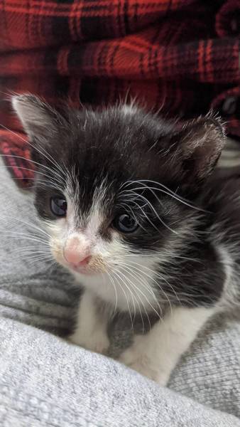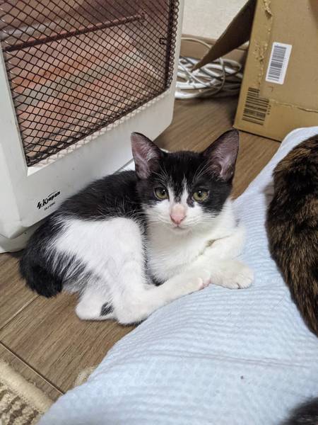 | 特徴(性格など) | はちわれの女の仔です。しっぽはボブテイル風味。 保護当時は発育不足でしたが、離乳食から始めて今では日に70g4回に分けて食べています。 |