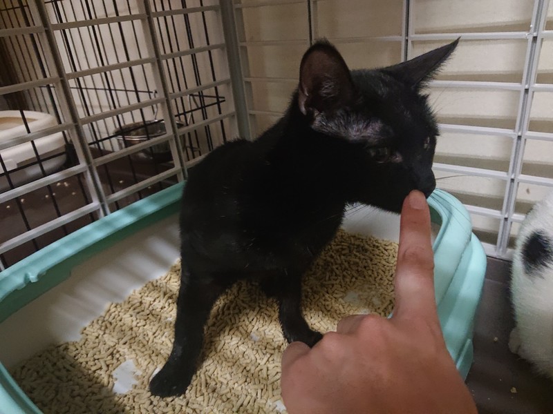 | 特徴(性格など) | 2017.8.15生まれ(推定) 毛色:黒 ちょっぴり寄り目気味の表情が可愛らしい黒猫男子♂ いつも隅や物陰からみんなを見守る引っ込み思案な性格ですが、目の前でオモチャを振って遊びに誘うとピョンピョン跳ねて遊んでくれます♪ 知らない人がいると、まだ緊張してしまうビビリさんですが、ゆっくりと指を使づければ鼻ツンツンしてくれることも♡ マイクのペースに合わせてゆっくり見守って下さる里親様募集中で~す!! |