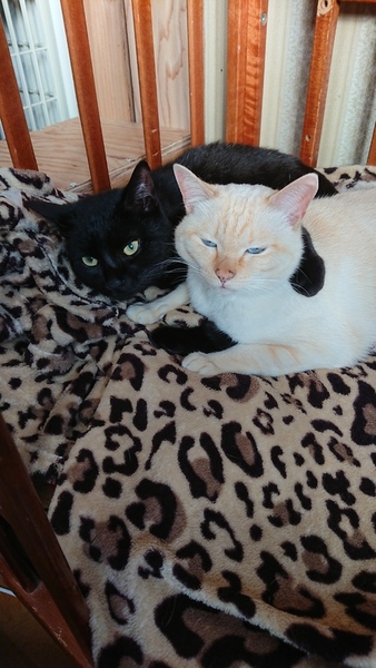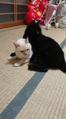 | 特徴(性格など) | 白と薄茶の模様が入ってます。 こちらはメスの白猫になります。 性格はおっとりさんで甘えたで寒がりなので布団の中に冬は入って来ます。 小さいボールが大好きです。 飼われるなら男性の方の方が懐くのが早いと思います。 黒猫の毛は白色が白髪程度に混じっています。お腹の所に小さい白色の毛が円形にあります。 性格は恐がりです。最初は威嚇してシャーと言いますが噛みついたりは無いです。馴れると甘えたでにゃーと鳴いて甘えて来ます。1人遊びが上手です。飼われるなら女性の方の方がすぐに馴れると思います。 |