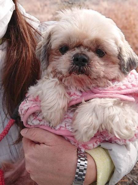 | 特徴(性格など) | 4キログラムのシーズーの女のコです。 まあるいかわいいお顔ですが、身体はガリガリに痩せています。これからいっぱい食べて身体もまんまるにかわいくなると思います。元気にお散歩しています。大人しい人懐っこいコです。 |