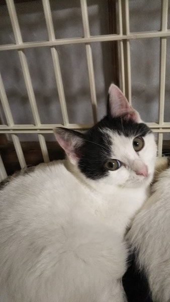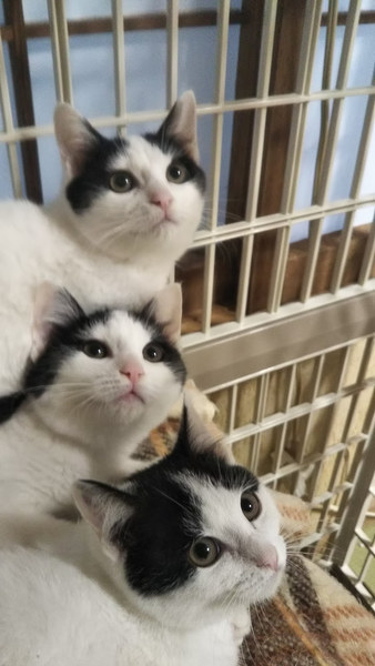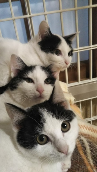 | 特徴(性格など) | ●猫の特徴 白黒MIX ●猫の性別 メス 1匹 ← メスは正式譲渡になりました! オス 2匹 ●猫の年齢 生後3ヶ月位 ●健康状態 良好。ノミダニ駆除済み 便検査、異常なし エイズ、白血病(陰性) ●現在のようすなど 3匹とも食欲旺盛で、寝る時はゲージで重なり合って寝ていますが、部屋中を走り回って元気一杯です。 食事の時にケージから出して、その後は暫く元気に部屋中を走り回り眠くなると、ケージで寝ています。 3匹共にパンダのようで、とてもよく似ています。 生まれてからずっと3匹一緒ですので、2匹一緒に迎えてくださると嬉しいです。 1匹ご希望の場合は、先住猫ちゃんがおられるところなら寂しがらないと思います。 |