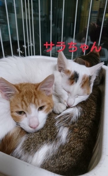 | 特徴(性格など) | 仮名「サラちゃん」 ワクチン済み、駆虫済み、ウイルス検査白血病、エイズ共に陰性 白三毛の女の子 甘ったれのおてんばさんです。 初め会う人にはちょっと距離をおく様子を見せますが、三毛猫さん特有のツンデレです。 撫でるとゴロンとしてじゃれてくる可愛い子です。 中学生以上でしたらお子さんのいるご家庭や初めて猫を飼う方でも大丈夫です。 ちょっとタレ目な困った顔が可愛い小柄な女の子です。 |
