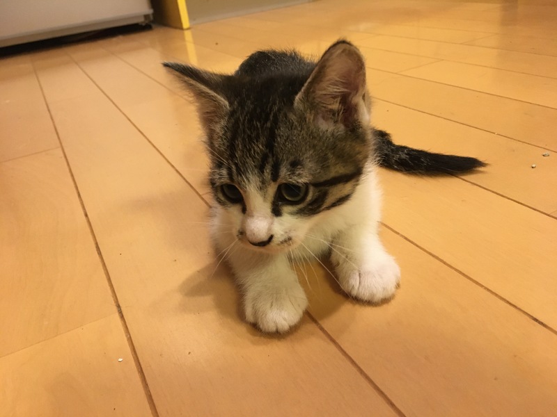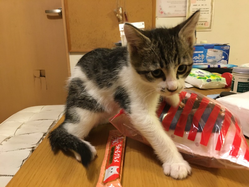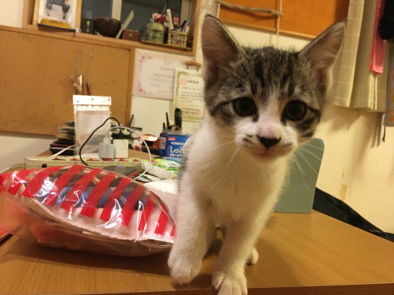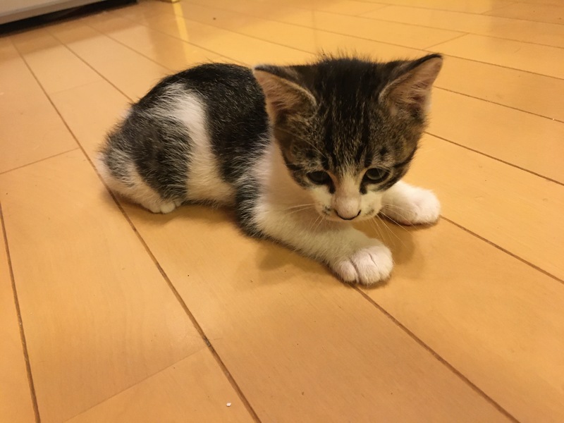| 特徴(性格など) | 雄猫で白に虎模様です。まだ子猫なので大人しいです。トイレは上手にできるようになりました。 | ||