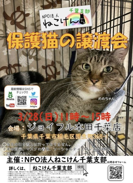 | その他(譲渡条件など) | ペットとしてではなく、生涯家族として猫を迎えて下さる方への譲渡となります。 原則ねこけん譲渡会等でのお見合いにてお申込みをお願いしております。 ◆猫さんたちとのお見合いは「ねこけん譲渡会」or「完全予約制個別お見合い」で◆ 現在ねこけん譲渡会「虎ノ門会場」および「練馬会場」での定期開催は自粛しております。 譲渡会等イベント開催日程・詳細は、下記URLよりご確認いただけます。 ↓ねこけんイベント一覧↓ https://satoya-boshu.net/event/?@button_name@=search&Event_MemberID=1288 ※譲渡会へお越し頂く際 、事前のご予約等は必要ありません。 ※掲載中の猫さんであっても、当日の体調などにより譲渡会を欠席することがあります。 個別お見合いご希望の方はこちらの募集サイトのアンケート、もしくは下記連絡先よりお問い合わせください。 家族を待っている猫さん達が沢山参加します♪ ========== ◆必ずお守り頂く事◆ ①終生飼養 ②完全室内飼養 ③年1回のご報告 ④ペット飼育可能な物件にお住まいであること 不妊去勢手術・医療費の一部負担をお願いしております。 ◆譲渡費用について◆ お届けエリアによっては往復高速料金(実費)を別途ご負担いただく場合がございます。 なお、交通費に関しましては正式譲渡に至らない場合であってもご返却できませんので予めご了承下さい。 ・ご希望の猫さんと家族になるまでの流れ ・譲渡時にかかる一部ご負担金などの詳細 ・譲渡契約書のサンプル等 下記URLに掲載しておりますのでご確認ください。 http://nekoken.jp/jotokai/joto-nagare/ https://nekoken.jp/jotokai/joutokibou/ ◆引き渡し方法◆ 1週間程度のトライアルの後、正式譲渡となります。 必ずご自宅までお届けします。 ◆お届け可能エリアについて◆ 応募可能エリア内であっても、遠方の場合アフターフォローの関係上お断りさせていただくことがございます。 ご心配な際は、前もって市区町村名や最寄り駅等をメールにてお問い合わせいただけますと幸いです。 お手数をおかけいたしますが、何卒ご了承くださいますようお願いいします。 ご質問などお気軽にお問合せください。 〜連絡先〜 NPO法人ねこけん東京本部 https://nekoken.jp/inquiry/ nekoken@cat.email.ne.jp 担当:溝上 [ホームページ] http://nekoken.jp [ブログ] http://ameblo.jp/naoofjapan/ [Instagram] https://www.instagram.com/nekoken2222/ |