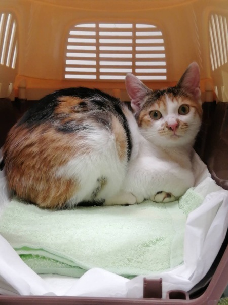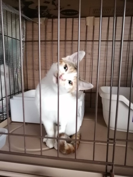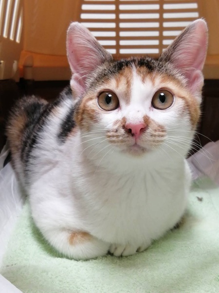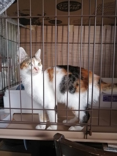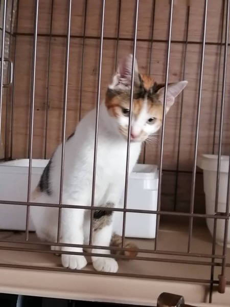 | 特徴(性格など) | 三毛が色鮮やかな、しっぽと手足の長いスタイルのいい女の子です。人の姿を見るとニャーニャー鳴いて甘え、ケージからお手々を出してスキンシップをしたがります。抱っこも大好きで、病院も全く怖がらない、とても飼いやすい子だと思います。 | ||