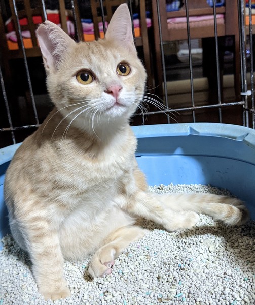 | 特徴(性格など) | ソイラテのような淡い色合いの茶トラでしっぽは長いです。人懐こい甘えん坊さんです。5ヶ月齢を迎え、好奇心も旺盛、年上でも年下でも他の猫と活発に遊ぶ様子がとてもかわいいこです。 | ||
