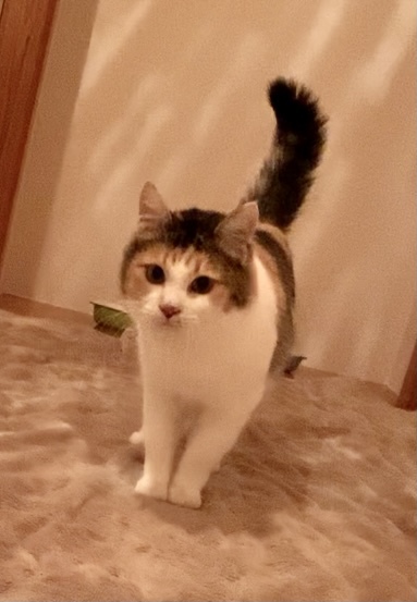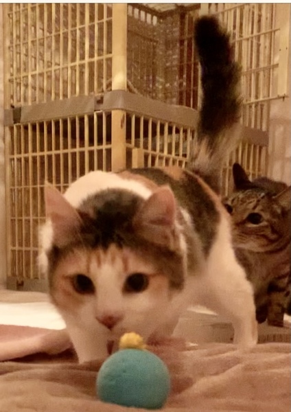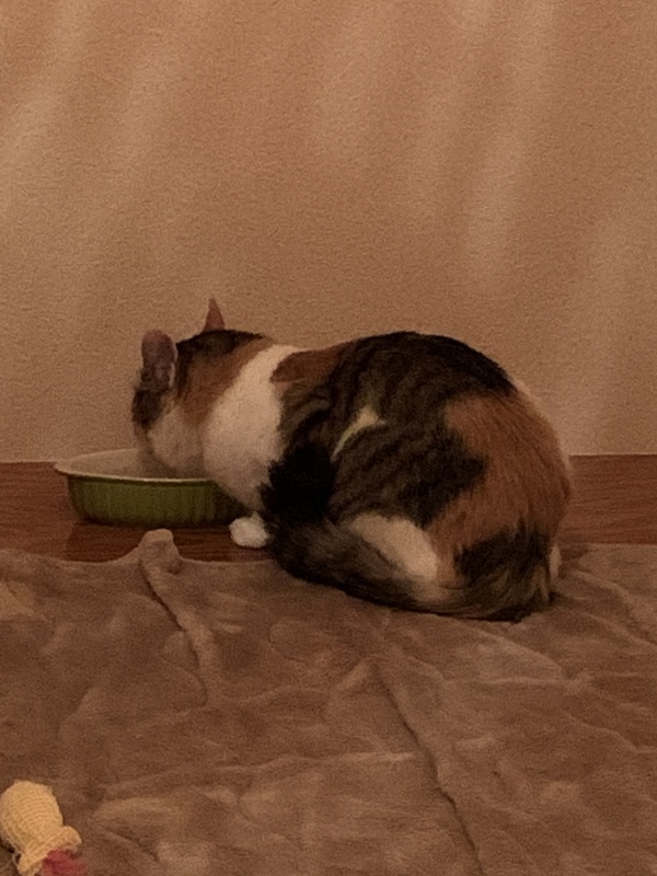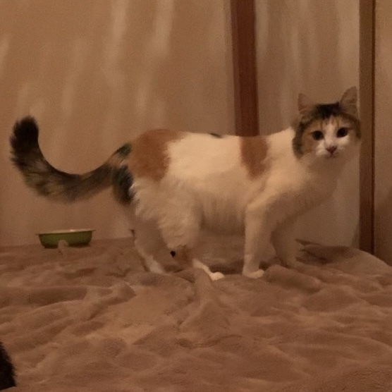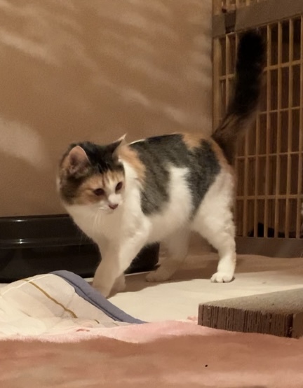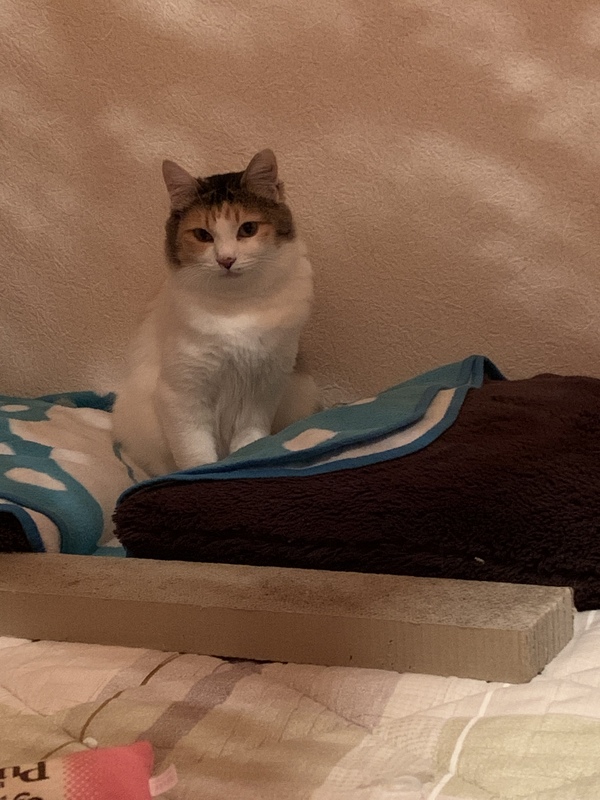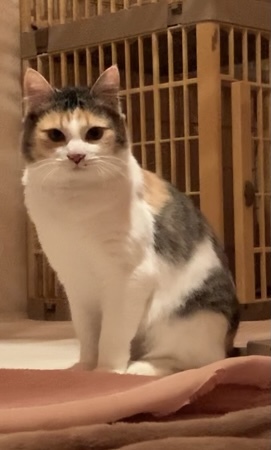 | 特徴(性格など) | カツラをかぶっている様な模様で、鼻の横にホクロのような点があります。 シッポだけ長毛で、クッキリした三毛の模様か綺麗な美人さんです。 猫は大好きですが、人間は怖いので最初は触れないかもしれませんが、ゆっくり向き合って下さる方にお願いしたいです。 |