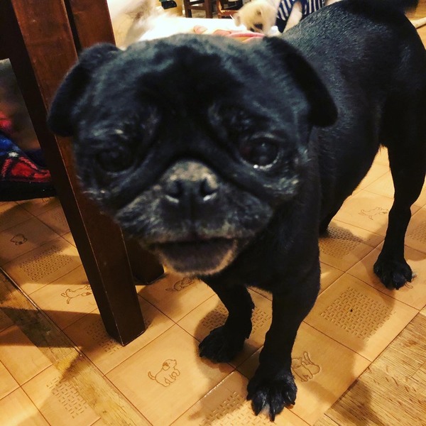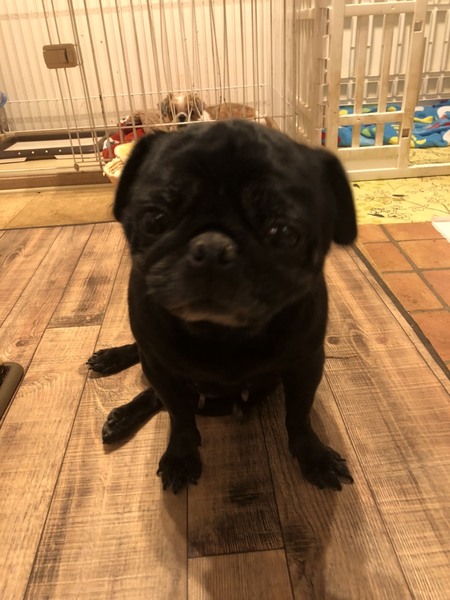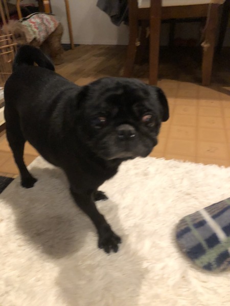 | 特徴(性格など) | 藍(からん)ちゃん 黒パグ 女の子 推定5-6歳 体重7.2キロ 目は乾性角膜炎ですが、視力はあります。 バフバフ言いながら、家の中を歩き回っております。 ご飯は、器に顔いっぱい入れて食べるので、器からはみ出し床に散乱しながら一生懸命食べています。 とても癒されます。 穏やかな性格の花藍ちゃんです。 |
