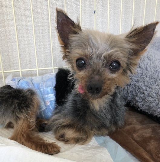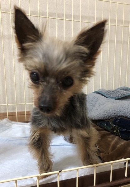 | 特徴(性格など) | ヨーキーの力丸(りきまる)君です。 推定年齢10歳以上 体重1.9キロ 瘦せすぎているため、2.2キロぐらいを目標。お腹が弱く、まだ目標には至っておりません。 小さくてかわいらしい子ですが、現在、保護時に汚れた毛を短く切ってあり、また、体重も少ないためまだ 本来のかわいさを発揮しておりません。 誰にでも人見知りなく、ようこそ~ウエルカム~な甘えん坊。 甘えるときは、身体をすりすりしてきます。抱っこはまだ苦手な様子。 りき君のルーティーンは、 ケージから出ると、チョコチョコ動き回り、ご飯をもらってしばらくすると、ゲージに戻って眠ります。いったん寝ると、爆睡してしまい、周りが多少うるさくても、ぐっすり・・・です。 いろんなことが初めて!これなぁに?とお家の中をトコトコ、探検したり、おもちゃを振り回して遊んだり…まだまだやる気いっぱいの元気なシニアヨーキーです♪ トイレは、練習中で成功率50%ぐらい。 散歩は、現在、最低限の筋力をつけるため、室内を自由に歩かせています。お散歩は、芝生など足腰に負担のない柔らかいところのみOKの段階です。 せっかく保護されて再スタートを切ったので、彼の幸せを一緒に感じながら見守ってくださる優しい里親さんを募集しています。 ★首輪は使用禁止です★ |
