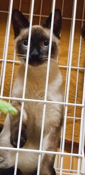 | 特徴(性格など) | タイ猫そっくりな見た目の男の子です。 普段はゲージ内で飼育しており、去勢手術を行ってから決められた範囲ですが室内で自由に過ごさせる時間も設けています。 その際、まだまだ幼くて元気一杯なので走り回ったりはしますが困った悪戯などはしません。ひとりでも、また人とも遊ぶことが大好きな子です。 また、撫でてもらうことも好きなようで、掌を差し出すとごろごろ言いながら寝っ転がって身体中を撫でさせてくれます。 人と生活を合わせてくれる子のようで、夜間はゲージ内に帰しておけば大人しく寝てくれます。 |