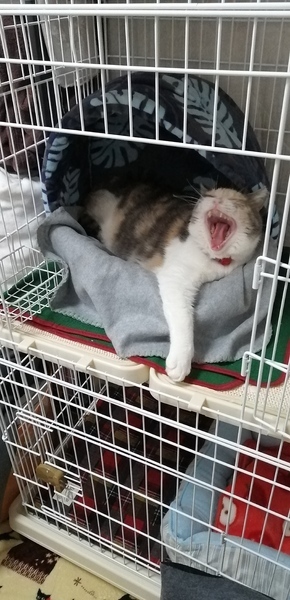 | 里親募集する理由 | 今年の1月、ひどい風邪を引いてしまい、ごはんも食べられなくなっていたので連れて帰り治療しました。 寒さに弱く、洋猫混じりで鼻が低いので鼻がつまりやすいようです。 今は風邪も治り、食欲満点です! |