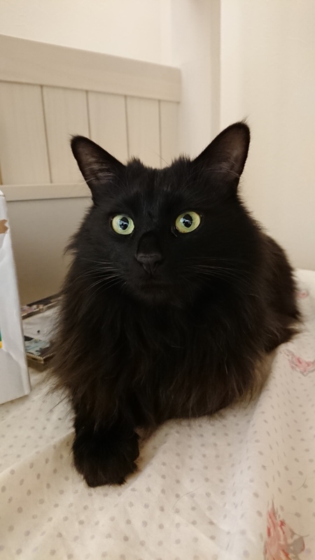 | 特徴(性格など) | 黒の長毛。とてもふわふわしています。寂しがり屋で甘えんぼな性格です。 | ||