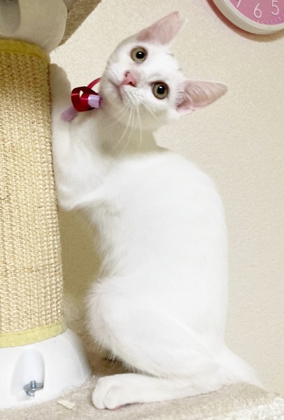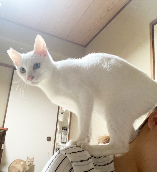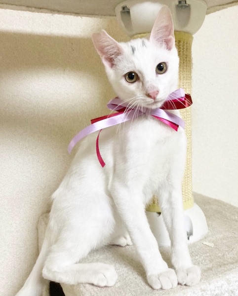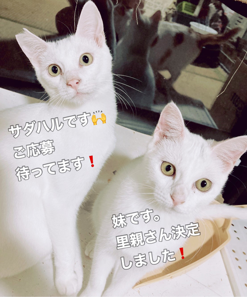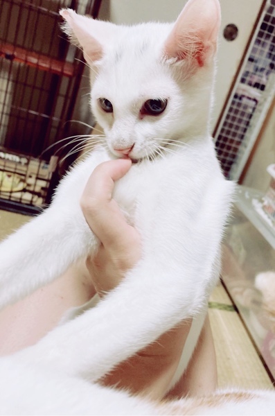 | 特徴(性格など) | 全身白い毛ですが、唯一目の上にだけ眉毛のように黒い毛が少し生えています。(妹ちゃんは片方だけ眉毛があります。)保護されたときは痩せていましたが、現在ではよく食べ、よく寝て、健康状態はとても良好です。食事もドライ、ウェットともに好き嫌いなくよく食べ、お腹の調子もいいです。 病院にて、初期検査の虫下し、レボリューション、ワクチン済んでおります。 現在はボランティアさん宅で過ごしています。とても甘えん坊ですぐ肩に乗ってきます。猫ちゃんとスキンシップをとるのがお好きな方にはたまりません。小さな頃から他の猫ちゃんと関わって育ってきていますので、人、猫ともにすぐに馴染めると思いますので、先住猫ちゃんがいらっしゃるお宅でも安心な猫ちゃんです。 去勢手術も済んでおり、食事の間隔も長くなってきましたので、体力的にお留守番はある程度出来ます。ですが、とても甘えん坊なので、猫ちゃん一頭だけでのお留守番はなるべく短い方が、負担なくスムーズに慣れていけると思います。 |