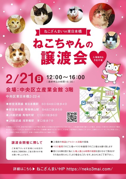 | その他(譲渡条件など) | 【新型コロナウィルス感染予防対策について】 譲渡会開催に際し、ご来場下さいます皆様には以下の内容をご理解頂き、ご協力頂けます様お願い申し上げます。 ●入場前の検温とアルコール消毒の実施 ●マスク着用でのご入場=マスク未着用でのご入場はお断り致します ●入場人数の制限=一度に入場できるのは50名迄とさせていただきます ●時間と人数の制限=密になる事を防ぐ為に入場人数とお時間の制限を設けさせて頂きます その為お待たせしてしまう場合もございます ●会場利用規約により、ご来場者様の連絡先を控えさせていただきます あらかじめご了承下さい 里親様決定は14時以降となります。 その後、迎え入れ準備の説明等のお時間も頂戴しますので、お時間に余裕を持ってご来場下さい。 諸々の制限がございますが、安心・安全な譲渡会運営のためにご理解・ご協力いただきますようお願い申し上げます。 ~~~~~~~~~~~~~~~~~~~~~~~~~~~~~~ ★仔猫ご希望の里親様★ 仔猫ちゃんたちは、まだ体がしっかりしていない赤ちゃんです。 下痢だけでも数時間対応ができなかっただけ死に至る事もあります。 その為、月齢に応じたお留守番時間を設けさせていただいております。 また、子猫ちゃん(6ヶ月未満)の里親様には子猫支援金のご協力をお願い致しております。 ★猫ちゃんとのお見合いは譲渡会で!★ ねこざんまいの猫ちゃんは譲渡会でのお見合いのみとなります。 『この子はいつ譲渡会に参加するの?』『譲渡会場の場所はどこ?』など はねこざんまいホームページをご覧ください。 https://neko3mai.com/ ★楽しく猫ちゃんと触れ合って★ ねこざんまい譲渡会は、猫ちゃんも里親様も保護主も笑顔で過ごせる譲渡会を目指しています。 これから20年以上、楽しい時も、悲しい時もいつも傍にいてくれる大切な家族になる猫ちゃんです。 会場には沢山の猫ちゃんがいます。 1匹1匹、触れ合って猫ちゃんとお話ししてください。 『初めて猫ちゃんを家族に迎える方』 『先住猫ちゃんのお友達を迎える方』など トライアルの仕方や先住猫ちゃんと仲良くなるコツなど経験豊富な保護主やスタッフにお気軽にご相談ください! 猫を愛し、そして猫に愛されている猫好きスタッフと保護主がアドバイスさせていただきます。 ★里親希望のみなさまへ★ ペットではなく、家族一員としてたっぷり愛情を注いでくださるご家庭をお待ちしております。 恐れ入りますが、 ・学生の方 ・一人暮らし、同棲中の方 ・子猫、若猫希望の60歳以上のみのご家庭 ・脱走防止対策にご協力いただけない方 は原則譲渡を遠慮させていただいております。 ただし、預かりボランティアさんとして新しい家族が決まるまでの間、猫ちゃんを預かっていただく道もございます。 参加猫ちゃんは、それぞれ保護主(実際に猫ちゃんを自宅に入れ、保護をしている方)が異なります。 詳しい条件なども異なる場合がございますので、会場内で直接保護主とお話ください。 〖共通条件〗 1.終生飼育 2.完全室内飼い 3.脱走防止対策へのご協力 4.避妊去勢手術 5.契約書類へのサイン 6.定期報告 7.医療費等の負担 当日の猫ちゃんを連れて帰ることはできま せん。後日、保護主が里親様のご自宅までお届け致します。 その為、移動の際の猫ちゃんの負担を月齢などから考慮し、お届け地区を限定させて頂くこともございますのでご了承ください。 ご理解とご協力のほど宜しくお願い致します。 ☆よくある質問☆ ・譲渡の条件 ・ご負担頂く費用 ・譲渡会の場所等は ホームページに詳しく掲載させて頂いておりますのでご覧ください。 https://neko3mai.com/ メールでのお問い合わせはすぐにご返答出来ない場合がございますのでご了承ください。 ホームページ https://neko3mai.com/ お問い合わせ http://www.neko3mai.com/contact/form_general.html ねこざんまいブログ http://ameblo.jp/neko3mai/ |