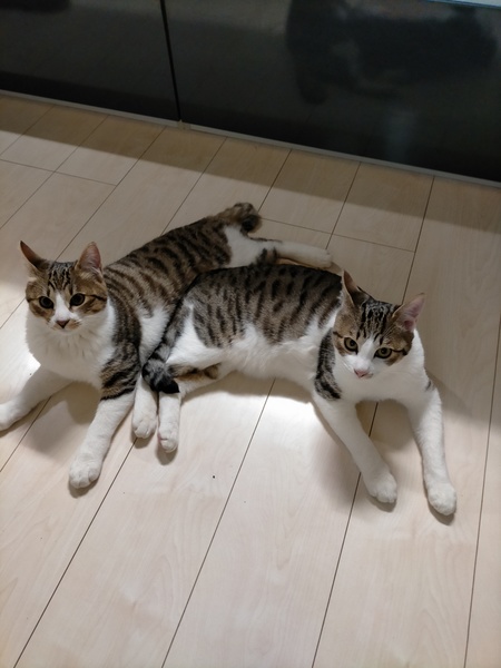 | 特徴(性格など) | ①キジトラ 【顔は面長・全体的に黒系】 元気いっぱいで人懐っこく…とても食いしん坊です。 ②キジトラ 【丸顔鼻先が茶模様・全体的に茶系】 元気いっぱいで人懐っこく…食いしん坊のちょっと小心者です。 |