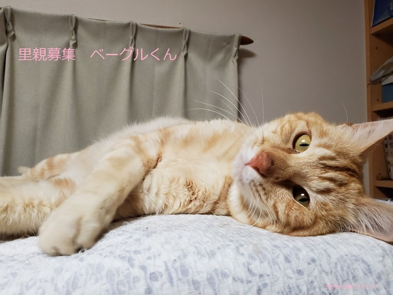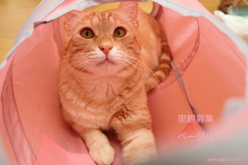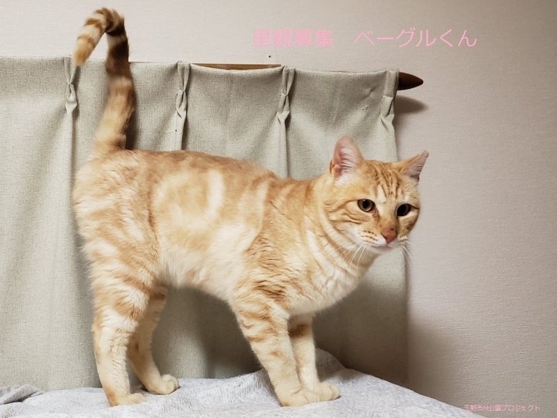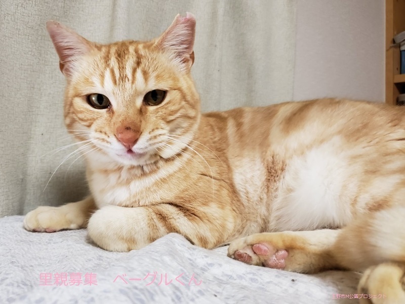 | 特徴(性格など) | 茶トラ猫、男の子、仮名:ベーグルくん 推定3歳くらい、体重4.2kg(2/8現在) 健康診断済み、駆虫済み(ブラベクトプラス1/31)、 血液検査-エイズ・白血病-共に陰性(2/8)、 三種混合生ワクチン接種(1/31) 去勢手術済み(2021.1/31)、 トイレしつけ済み 人慣れしていて甘えてきます。鳴いてアピールして、よく食べる元気な子です。 |