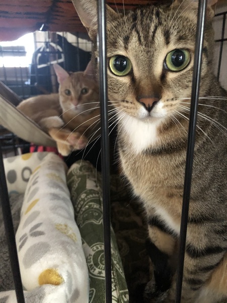 | 特徴(性格など) | 珍しいキジ茶白の女の子です。 姉妹です。 一匹だけの譲渡も可能です。 スグリちゃん、グミちゃんという お名前です。 スグリちゃんの方が人馴れが進んでいます。 そっくりな白ソックスを履いた 女の子です。 |