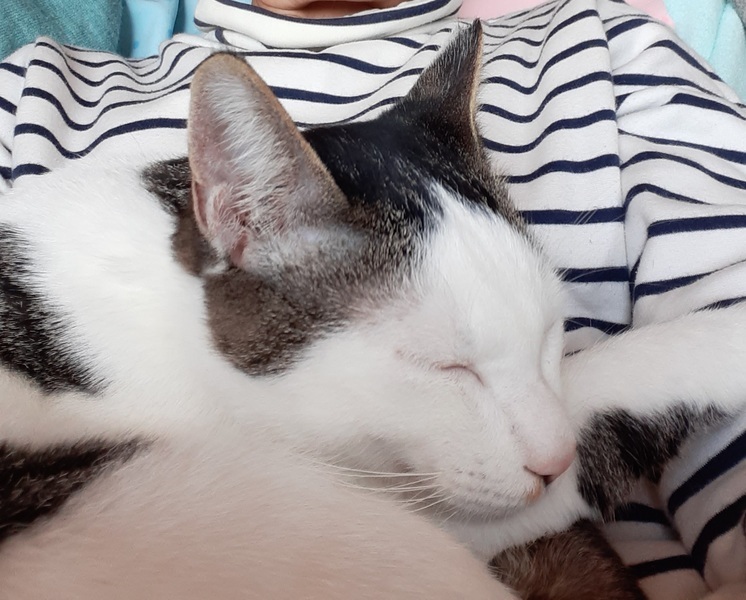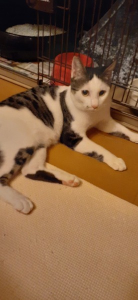 | 特徴(性格など) | 慣れるまでは少し臆病な性格ですが、慣れるとゴロゴロいって甘える可愛いサバシロの男の子です。 尻尾がとても長くてすらりとしています。 手足も長くて細身、アビシニアン風(笑)です。 去勢したせいなのか、寒くなってきたせいなのか、ソファーに座っていると、自分から乗ってきてそのまま寝てしまうこともしばしばです。 食いしん坊は相変わらずです? ピンクのお鼻と肉球がたまらなく可愛いです。 リッパな富士額(?)の日本男子。 元気に走り回っています。 |