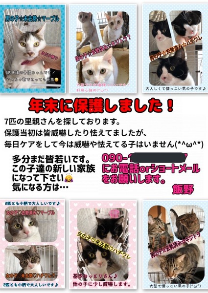 | 里親募集する理由 | 12月末に旦那の姪っ子が多頭飼育崩壊になり猫と賃貸そのままにして逃げた為保護しました。 | ||