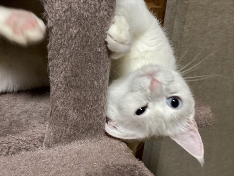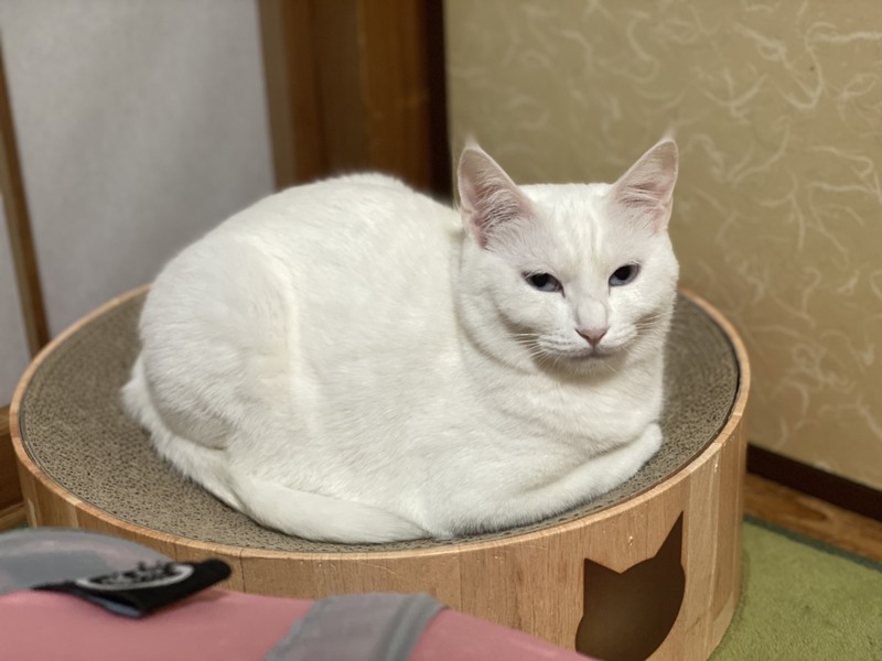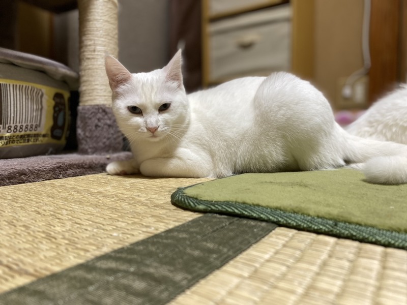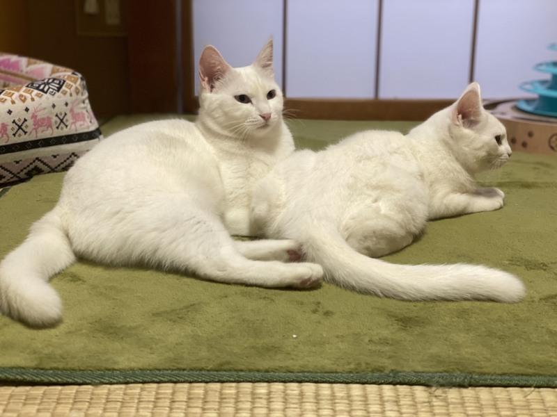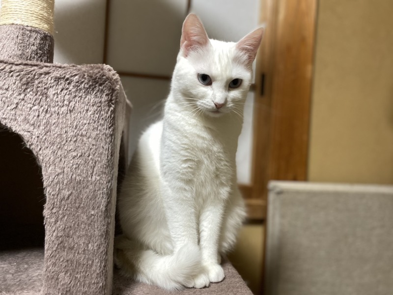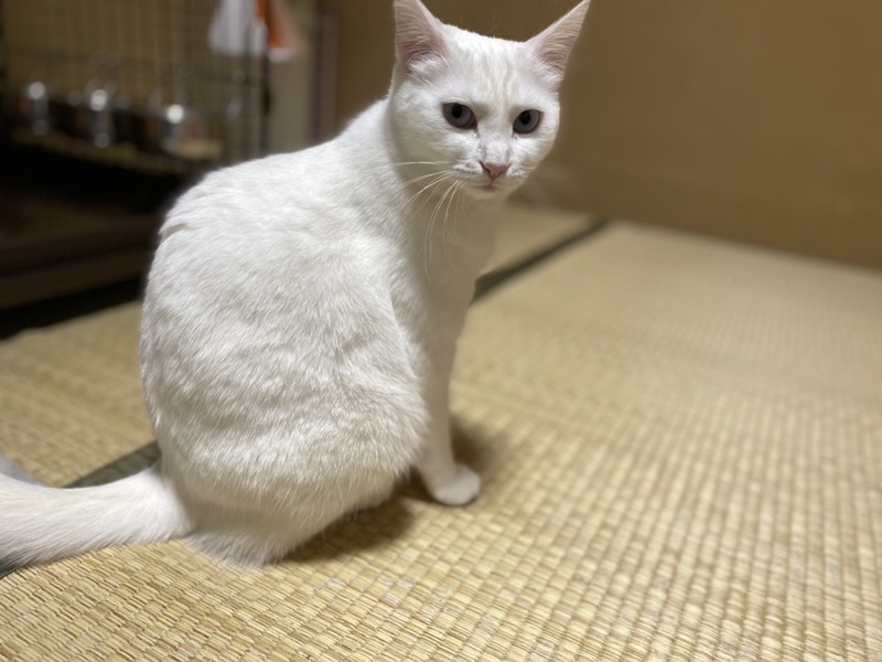 | 特徴(性格など) | 2019.1.9生まれ(推定) 毛色:白 全身真っ白ふわふわな毛並みの真白ちゃん♀ 2020年7月17日に白猫姉妹真紅(みく)&真黄(みき)を出産したお母さん猫です! ブルーに輝く瞳がチャームポイント☆ 抱っこは少し苦手ですが、ナデナデは大好き♪ 優しい性格なので、苦手な事をされてもするりと逃げるだけで、 威嚇や猫パンチなどはしないお利口さんです。 好きな遊びは猫じゃらし! 娘たちとまるで姉妹のように仲良く一緒に遊びます♪ キャットタワーやハンモック等、少し高い場所で過ごすのがお気に入り♡ これまで娘達とだけ過ごしてきたので、他の猫さんは苦手。 真白だけを大切にして下さる方、若しくは先住猫がいない環境で 娘の真黄と一緒の譲渡を希望します。 |