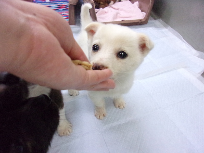 | 特徴(性格など) | 名前:とうふ ♀ 体重:約1.1㎏ 月齢:推定2.5か月 毛色:白色 性格:とてもシャイです。 アーモンド形の目で時々じっと見つめてくれます。 まつ毛もしっかり白い美人さんです。 現在のところ特段健康上の問題は見受けられませんが、体重が少ないので量を増やしたりと工夫中です。 保護して間もないので様子をみています。 まだ緊張しているのか兄弟姉妹の中で一番小柄で大人しいです。 だいぶ元気に動き回るようになってはきました。 現在駆虫薬投与中。 |