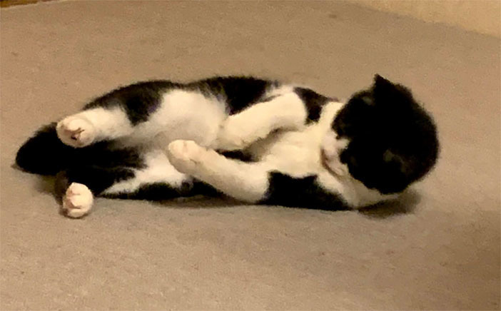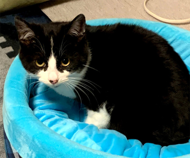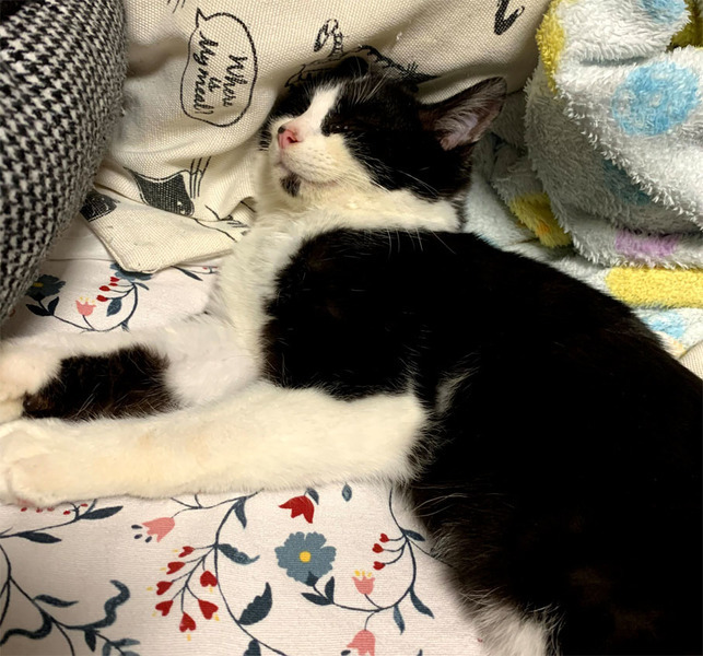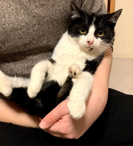 | 特徴(性格など) | ハチワレで毛がフワフワ、しっぽは短いです。 とてもシャイで、兄弟の後ろに隠れるような子です。 慣れてくると、抱っこで寝てくれとてもかわいらしいです。 同じ黒白の兄弟猫と、追いかけっこをしたり猫じゃらしで遊んだり、いつも一緒に過ごしています。 |