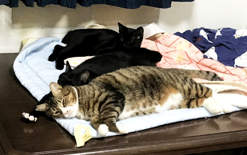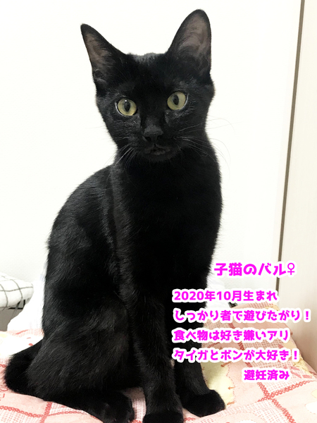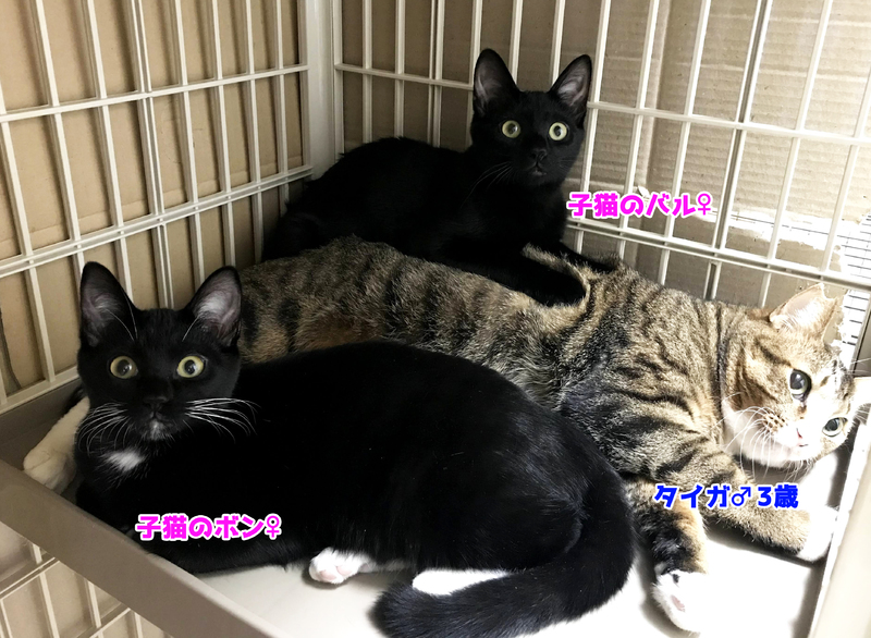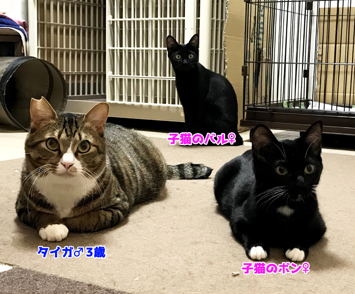 | 特徴(性格など) | 性格などは画像参照。全員ワクチン、避妊去勢済み 子猫のボン(顎白)…甘えん坊でナデナデ大好き! 子猫のバル(黒猫)…しっかり者で遊びたがり! タイガ♂(キジ白)…2020年6月頃保護。人間のことは怖がりますが猫同士にはとにかくやさしくて面倒見がよく、子猫たちを守っています。※エイズ陽性未発症 仲の良さや保護部屋での様子などはTwitterやブログでご確認ください! https://twitter.com/teresamama005 https://teresamama005.fc2.net/ |
