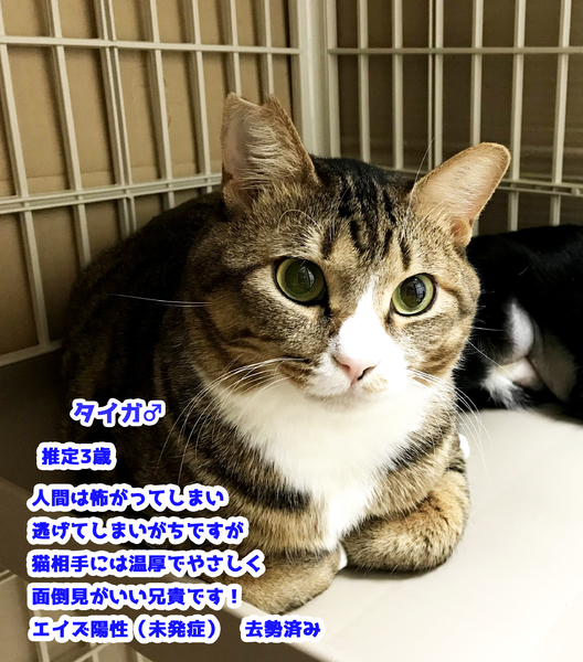 | 里親募集する理由 | 詳しい経緯、紹介はブログをご覧ください→https://teresamama005.fc2.net/ 「絶対に捕まらない母猫テレサ」という母猫から産まれた5匹の子猫たちが2020年11月に保護され、兄弟猫3匹は貰われ、残されたボンとバルの2匹は保護部屋の先輩であるタイガ♂に育てられ、べったりくっついてとても仲良しです。 |