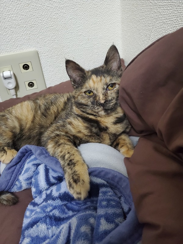 | 特徴(性格など) | サビ柄です。 ちょっとビビりですが慣れるとべったりで大人しいです。布団の中とか顔の上で良く寝ます。 大人しいと言っても玩具で良く遊びますしよく食べてよく飲みます。 爪切りは大人しいですがシャンプーは暴れます。 帰って来たときのお迎えは凄いです笑っ |
