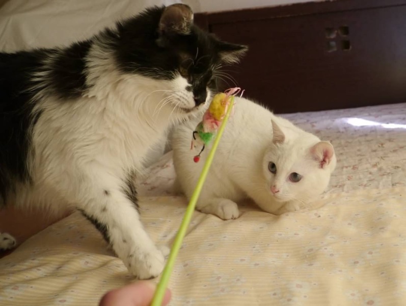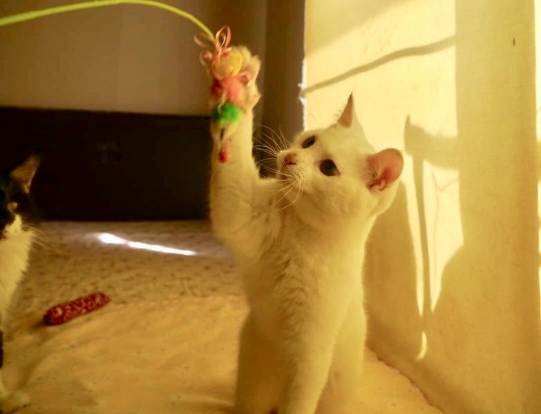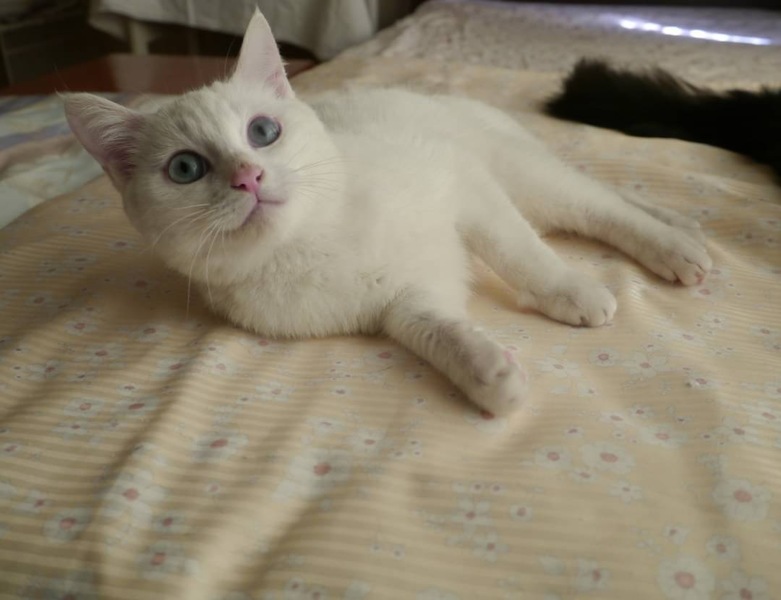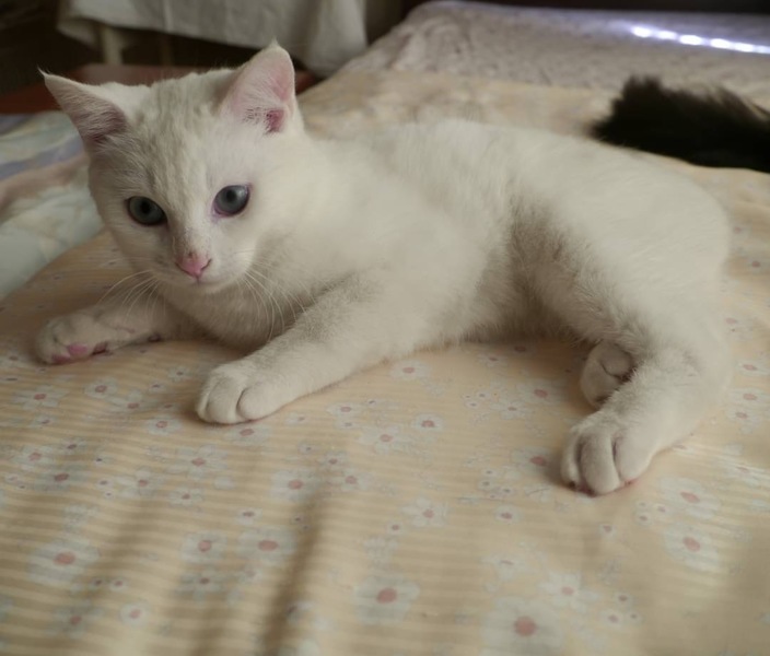 | 特徴(性格など) | 真っ白な毛にブルーアイの女の子みたいな顔立ちの男の子です(*^^*) 2cmくらいのしっぽが、ちょこんと付いてます。 遊べるものは何でもおもちゃにしてしまう元気で人なつこい子猫です。 控え目なところもあり、大きい猫たちには遠慮して足早に立ち去るところが面白いです。 |