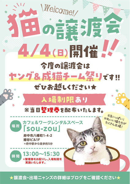 | その他(譲渡条件など) | ◆譲渡会案内◆ ♠︎令和3年 4月4日(日) ♠︎13時〜15時30分まで ♠︎会場は【カフェ&ワークスペース sou-zou】 ・京王線【府中駅】から徒歩5分 ・駐車場はございません。 ・お車でお越しの方は最寄りのパーキングにお願いします。 ・自転車を止めるスペースがないので、お近くの府中駅東自転車駐輪場をご利用ください。日曜日、祝日は、無料です。 ※会場へ直接のお問い合わせは、ご遠慮ください。 fuchu_nekonokai@yahoo.co.jpまで。 【カフェ&ワークスペース sou-zou】 http://sou-zou.jp/ ――――――――――――――――――――――――――――――――――――――― ◆譲渡会にお越し頂いた方を優先に譲渡したいと考えております。 ◆完全予約制ではありませんが、会場内の蜜を避ける為に、整理券を配布して入場制限をさせていただいきます。 ※予約制ではないので、時間内(13時〜15時30分まで)にお越しください。 (一組様30分制限とさせていただきます) ◆大変申し訳ございませんが、ご見学はお断りさせていただきます。 コロナ対策で蜜を避ける為にも、本気で猫ちゃんを迎えたい方々のみのご来場をよろしくお願い申し上げます。 ◆お子様のアレルギーが心配なご家族は、事前にアレルギー検査を受診されることをお勧めいたします。 ◆単身者の方は後継人が必要となります。お子さんがいらっしゃるご家庭で、初めて猫ちゃんを迎える方は、必ずアレルギー検査をした上でお越しください。詳しくは下記にあるURLを必ずお読みください。 ◆譲渡会に参加予定の方は、必ずこちらをご参照ください。 ↓↓↓ https://ameblo.jp/team-rose-cats/entry-12174516271.html ◆参加するにゃんずは、府中猫の会ブログ記事にて詳しくご紹介致しております。出場する子達の情報をいち早く知りたい方は、YouTubeの『ちゅー猫チャンネル』をご覧になられると保護猫達の様子がわかります! ぜひ、ご覧ください! ↓↓↓ https://m.youtube.com/channel/UC4YseOceX9CQfZtgXTg83sw ▲応募条件 ・ペット可の住宅。 ・完全室内飼い(脱走防止に配慮いただける方) ・定期的な健康check(必要な医療処置を含む) ・終生飼育(ご高齢または単身の方は、後見人相当の方のご同意をお願いします) ・ワクチン、去勢避妊の医療費(証明書類を提示またはお渡しします)を負担いただける方 ※リクエストに応じ環境に慣れるまでの間、ケージを無償レンタルすることも可能です(数に限りがあるので、その点ご承知ください) ▲応募可能地域 埼玉県南東部、東京都、神奈川県北東部. 移動による猫の負担を考慮し、調布飛行場から40km圏内にお住まいの方 詳しくは譲渡会場にてお尋ね下さい。 ※対応をスムーズに行うため、飼育経験,ご家族構成,応募の動機など、簡単なアンケート(当日配布)にご協力ください ※当日の引渡しではなく、後日ご自宅へお届けとなります ※当日ご来場不可の方は、開催日以降にmessage機能または、mailでお問合せ下さい。 ▲譲渡会の流れ https://ameblo.jp/team-rose-cats/entry-12174516271.html |